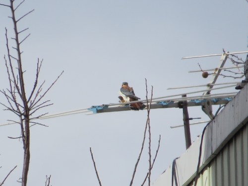 We know there are at least two males in the area, because we’ve seen them either together or simultaneously. This shot, from earlier this month, shows a male on the linden so popular back in November.