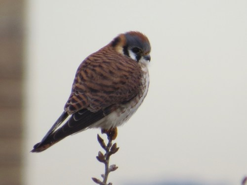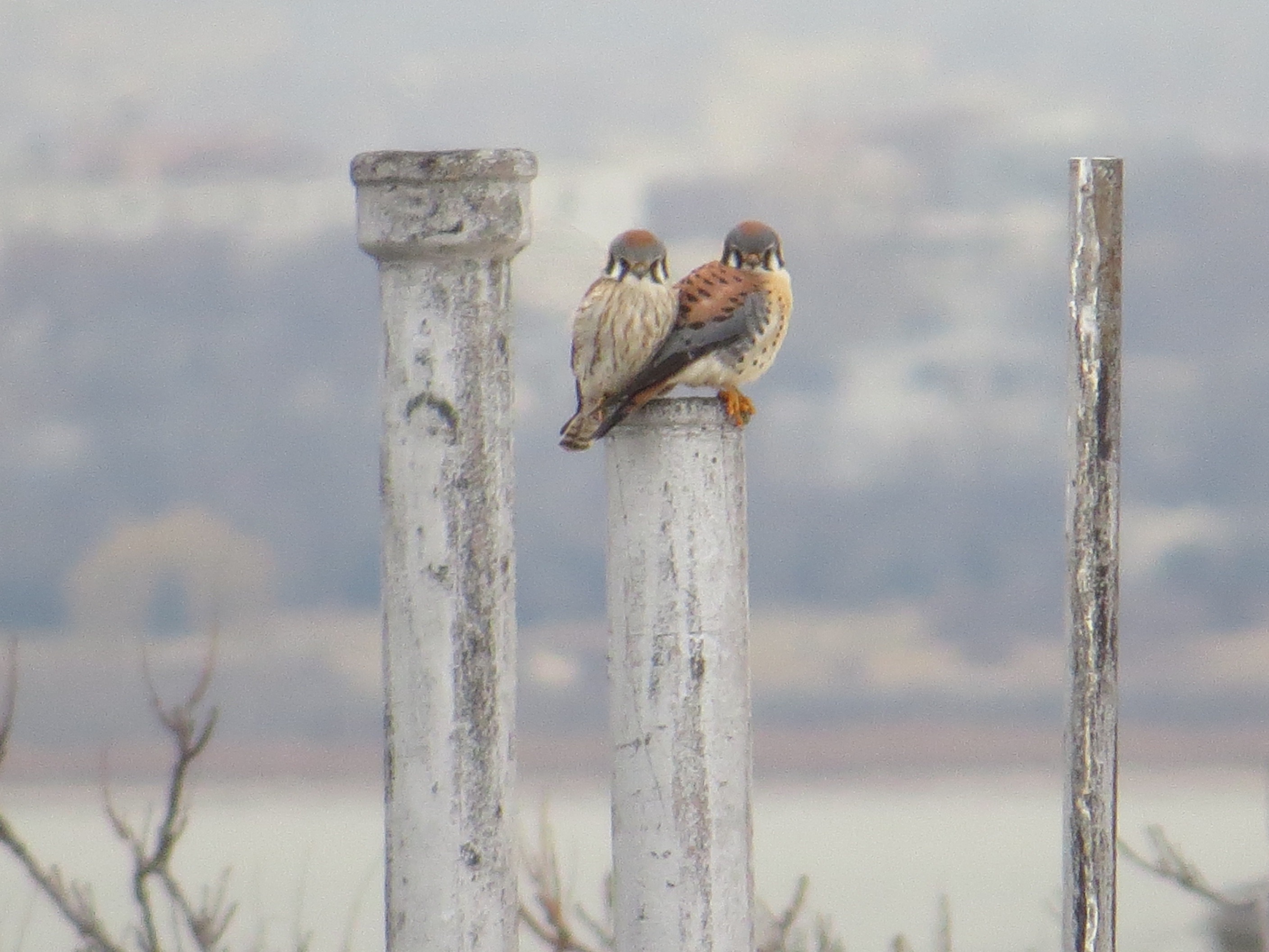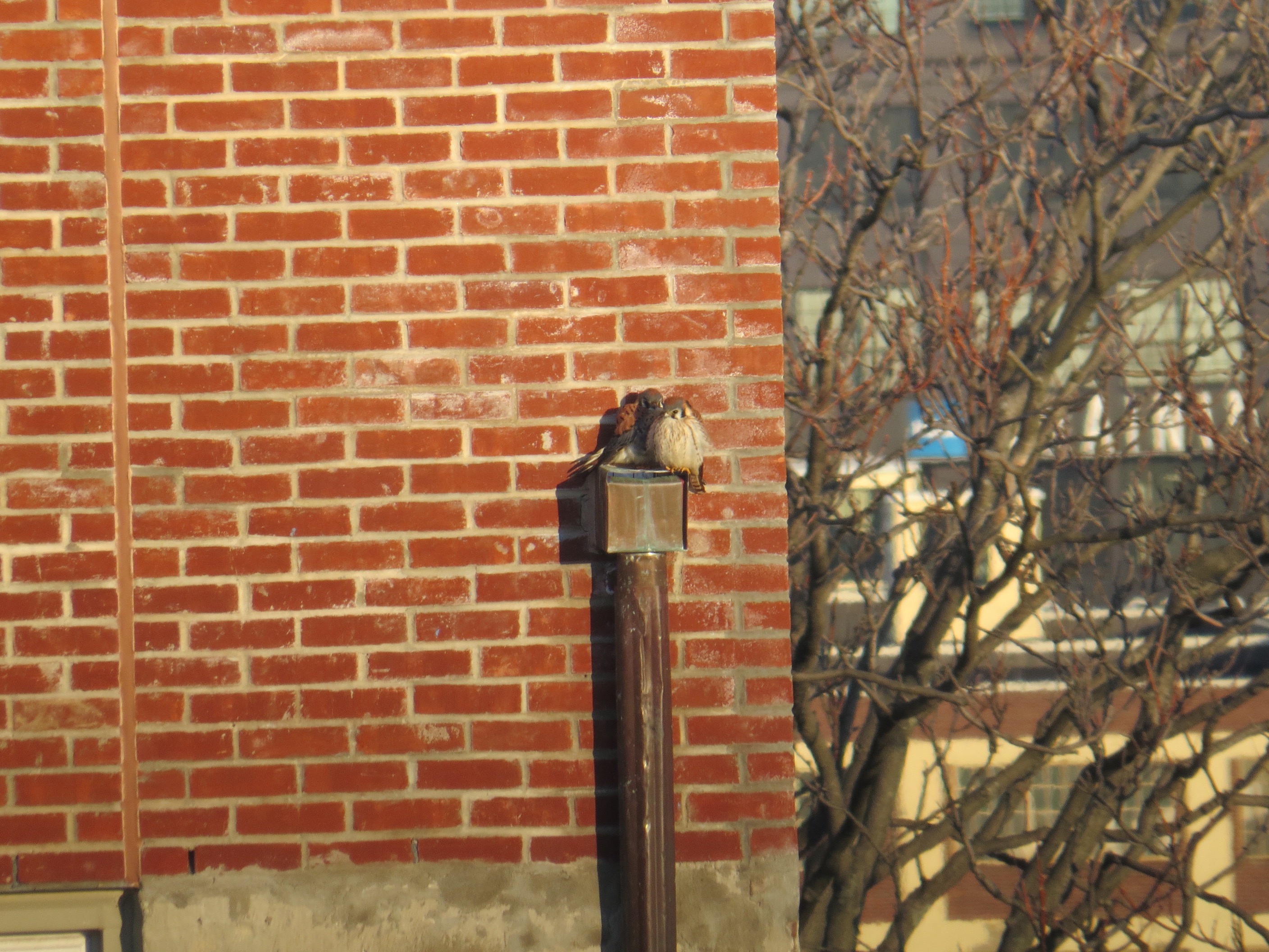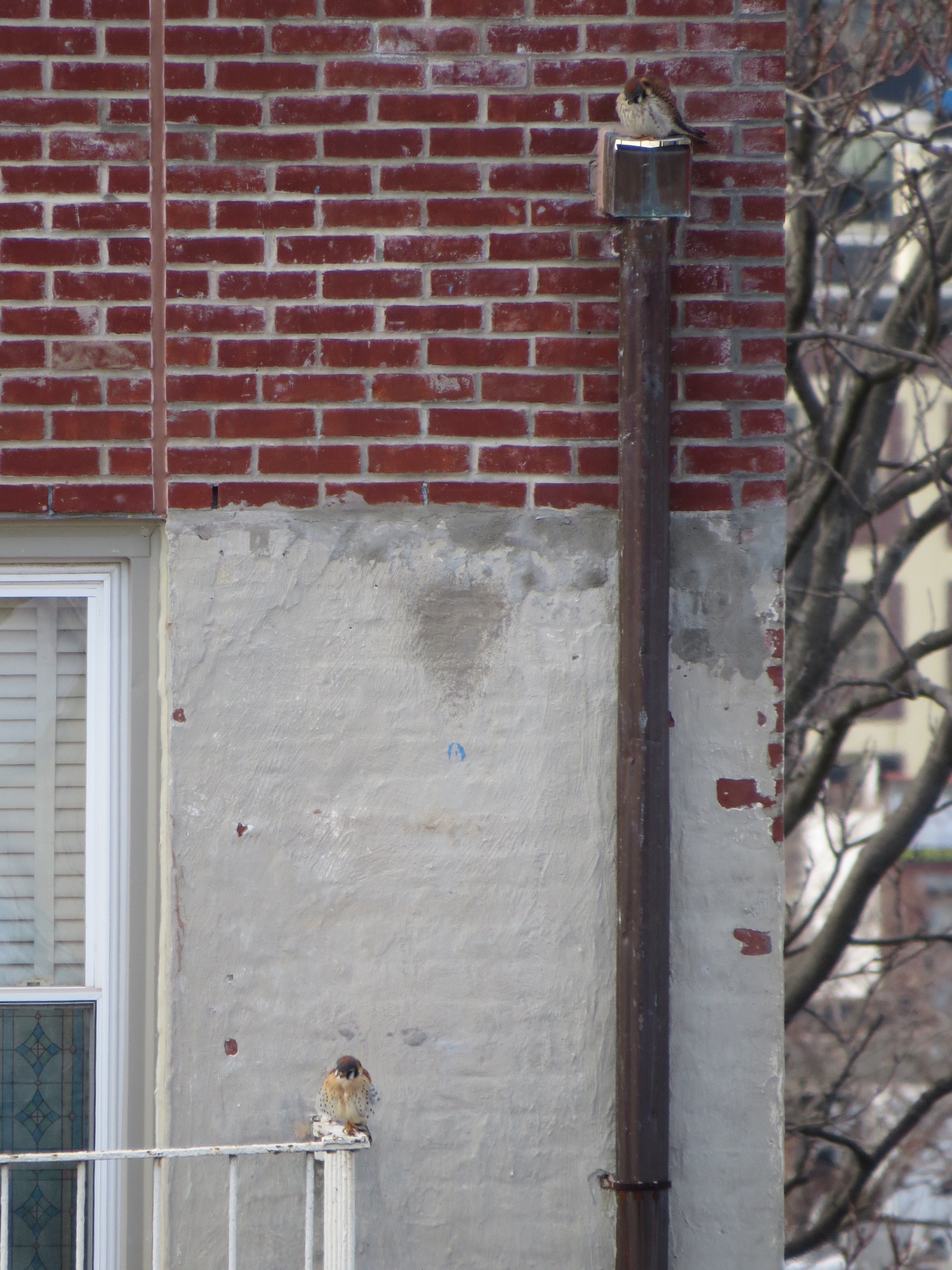 When you see a bird doing a series of wide-open yawn-like movements, they’re probably yawping up a pellet of undigested remains of yesterday’s meal. Two of these pellets are visible on this platform, there’s another behind her. They look turd-like, but avian excrement is liquid. These got lighter as they dried. A study of captive kestrels found they could take up to a day to process the remains and they most often puked them in the morning.