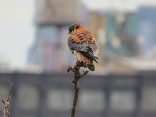 Saturday. The female had some prey, a small bird, probably House Sparrow. There aren’t many other options around here, yet. She flew down to the roof with her prey, then soon after flew up to another pipe without it. Too soon to have plucked, eaten the prey. Did she cache it?