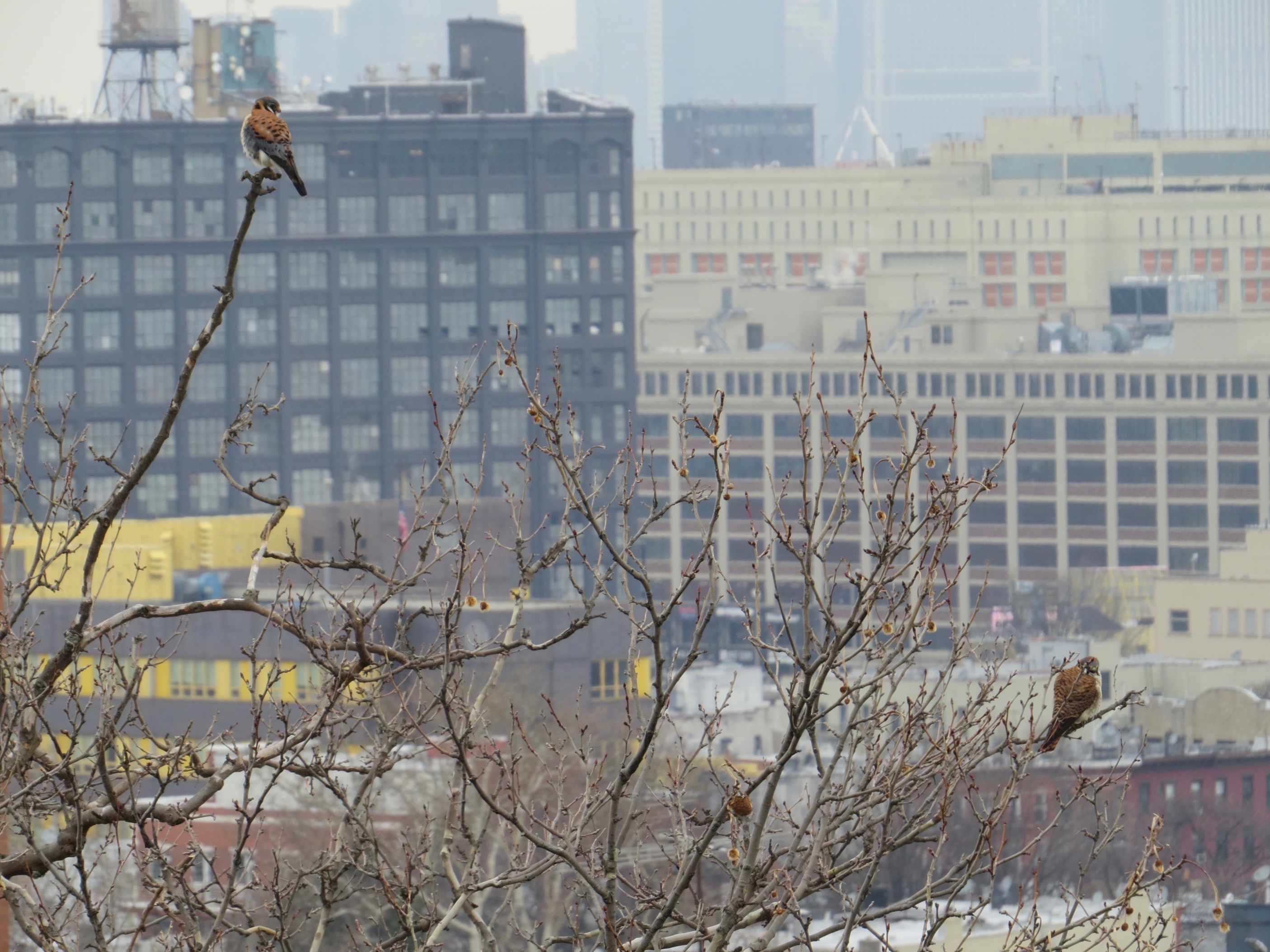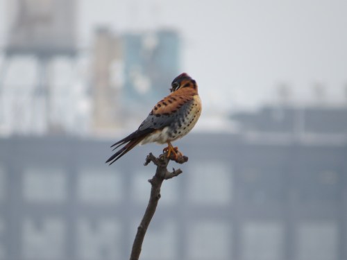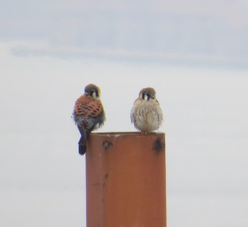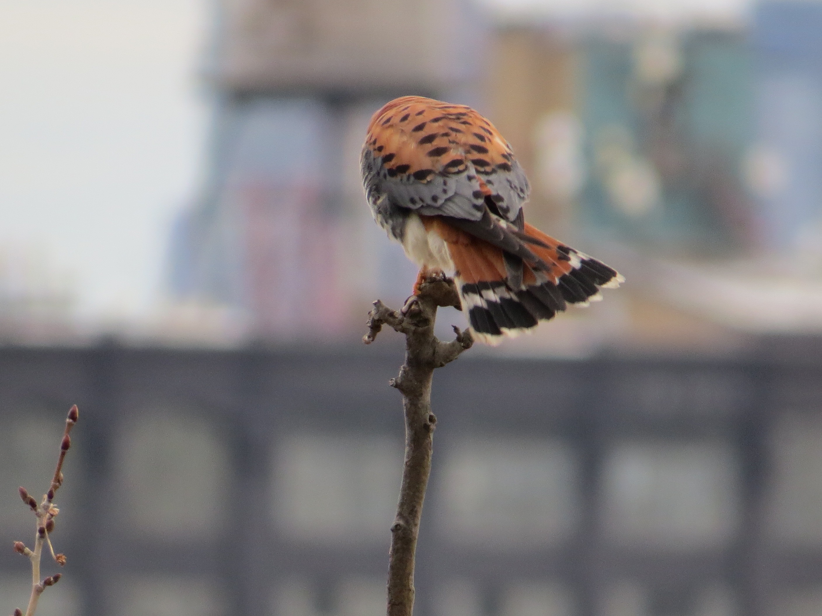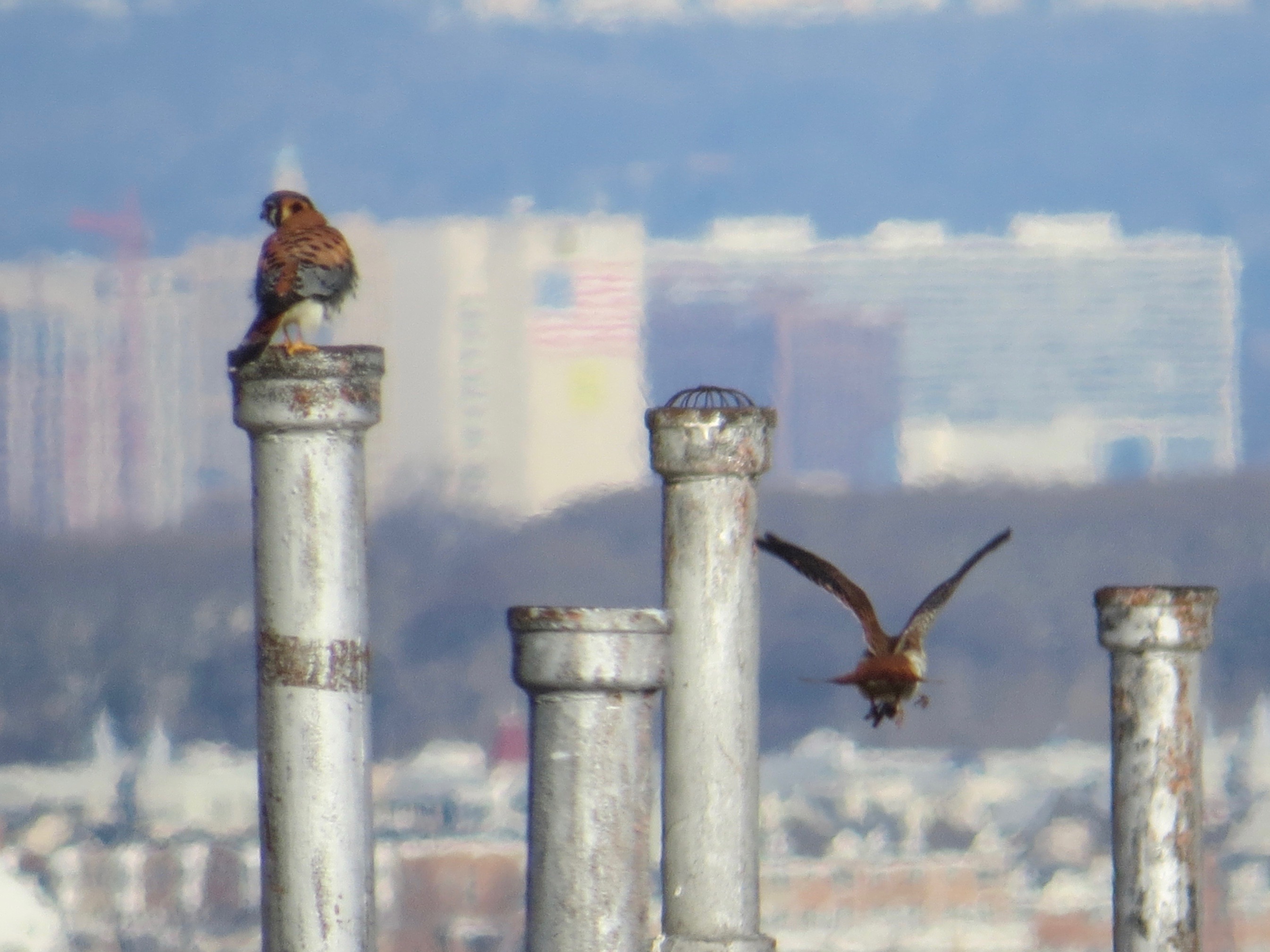 Saturday. The female had some prey, a small bird, probably House Sparrow. There aren’t many other options around here, yet. She flew down to the roof with her prey, then soon after flew up to another pipe without it. Too soon to have plucked, eaten the prey. Did she cache it?