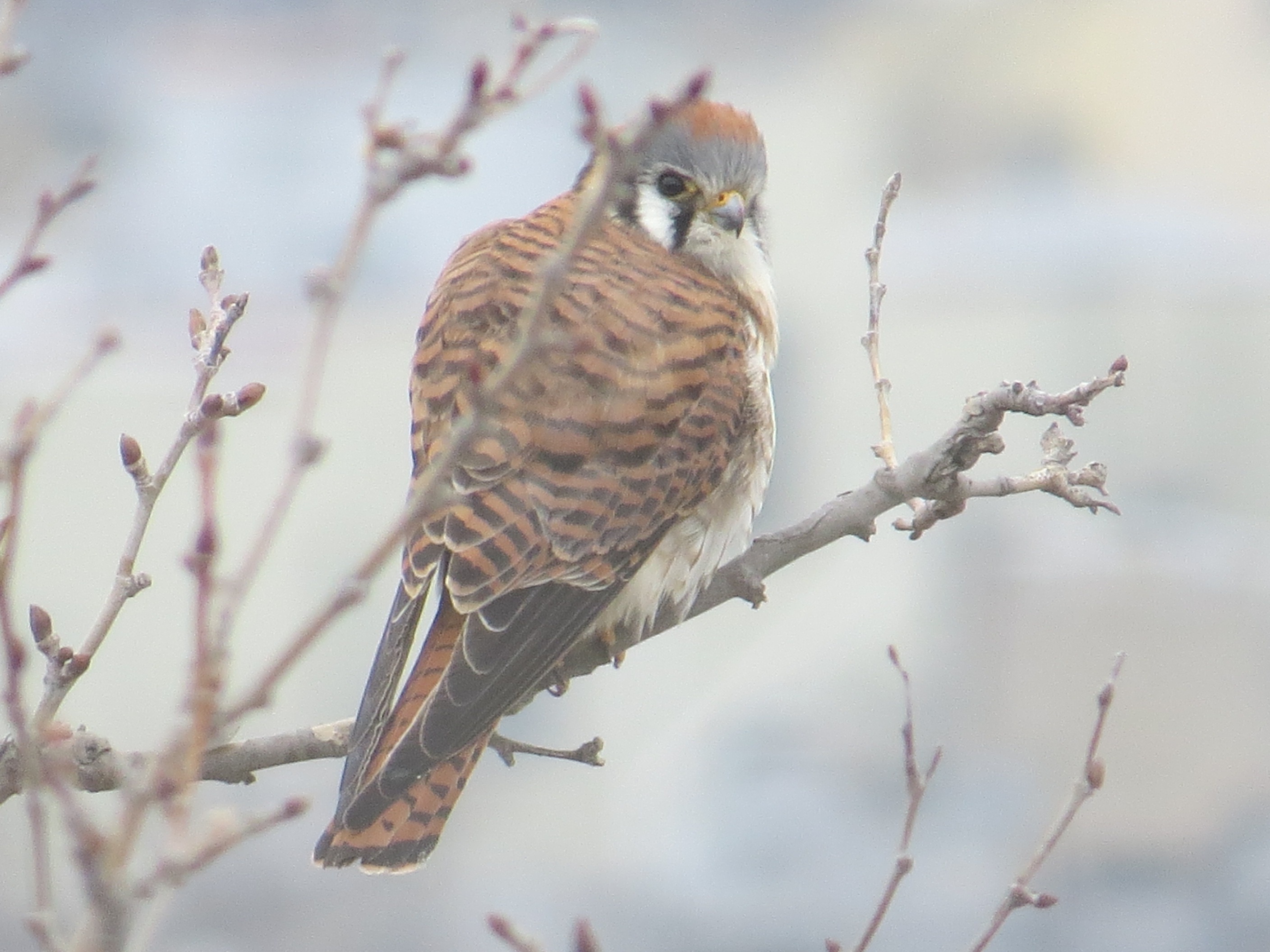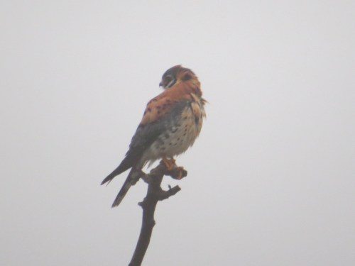 The days are getting longer. At 6:55pm, the latest I’ve ever seen one, the damp-looking male briefly perched as the fog thickened.
