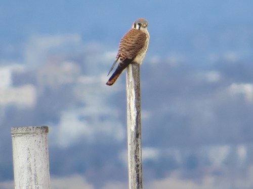 Walking up the hill after three days away from the Kestrel Lookout, I saw one of them go into the corner cornice hole. Bodega Kestrels are a go! The question is, are there eggs yet?