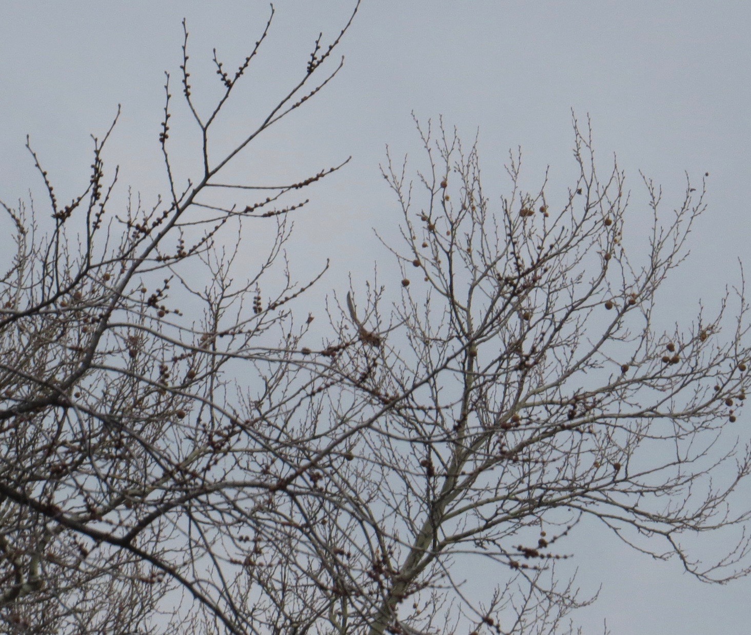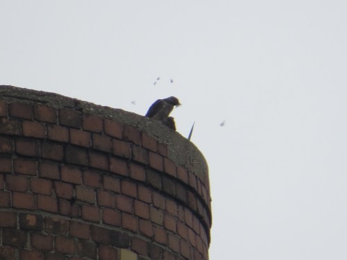 The sharp wings and the now dark grayish-looking larger bird combined to suggest Peregrine. What if…? I was heading in that direction anyway, so at 3rd Avenue I went out of the way to see if anything was happening on the Industry City smokestacks, two big brick chimneys that tower above the surroundings. The taller of the two has been the perch of a pair of Peregrines since late December.