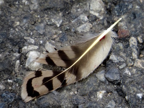 Some of the feathers came my way. The unfortunate prey was a Northern Flicker. The yellow-shaft is distinctive (on this coast; they’re red-shafted out West).