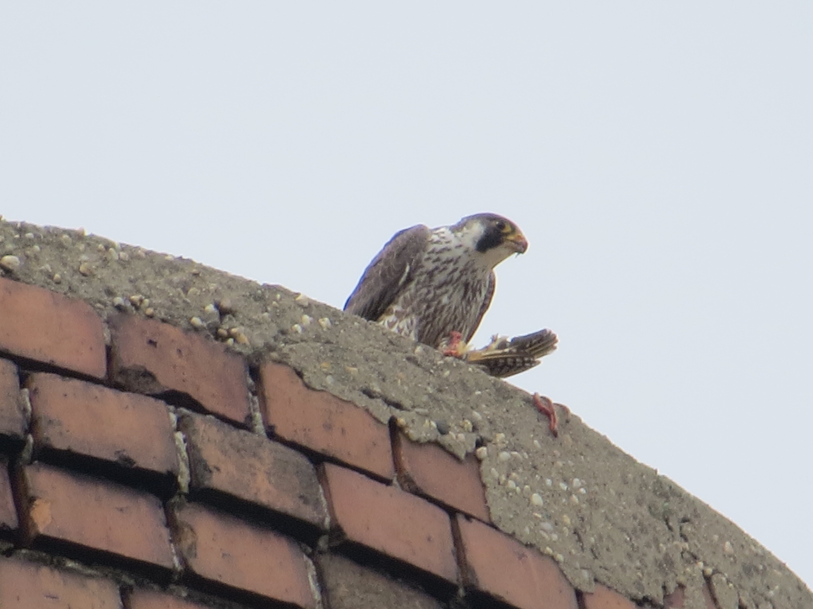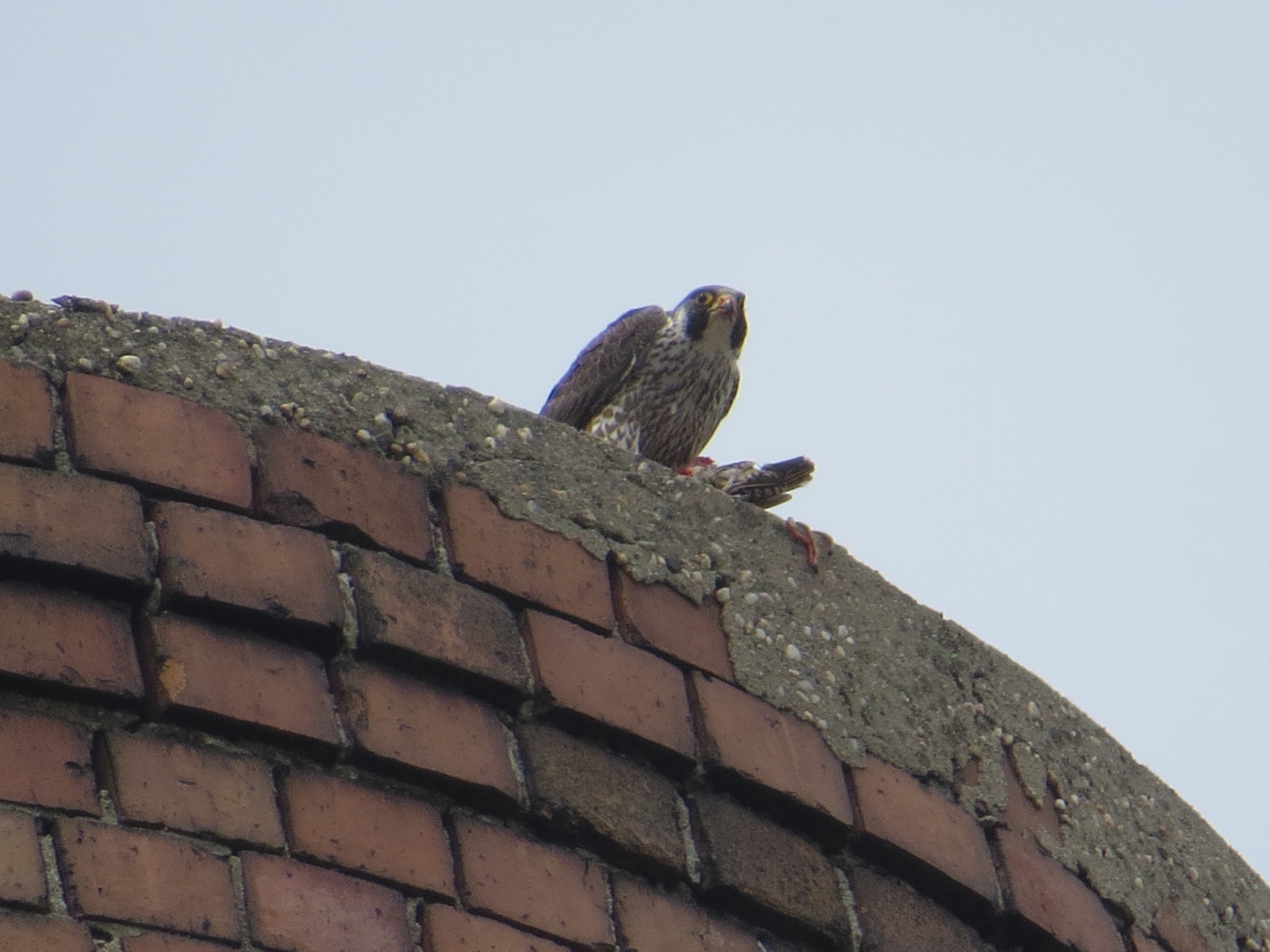 The shorter one now hosted a Peregrine plucking feathers from its prey.