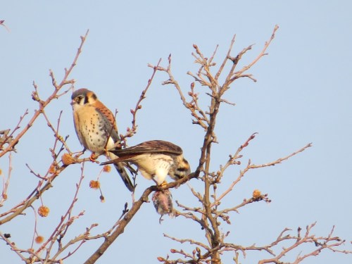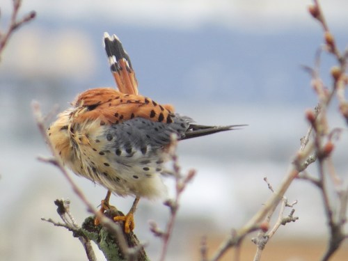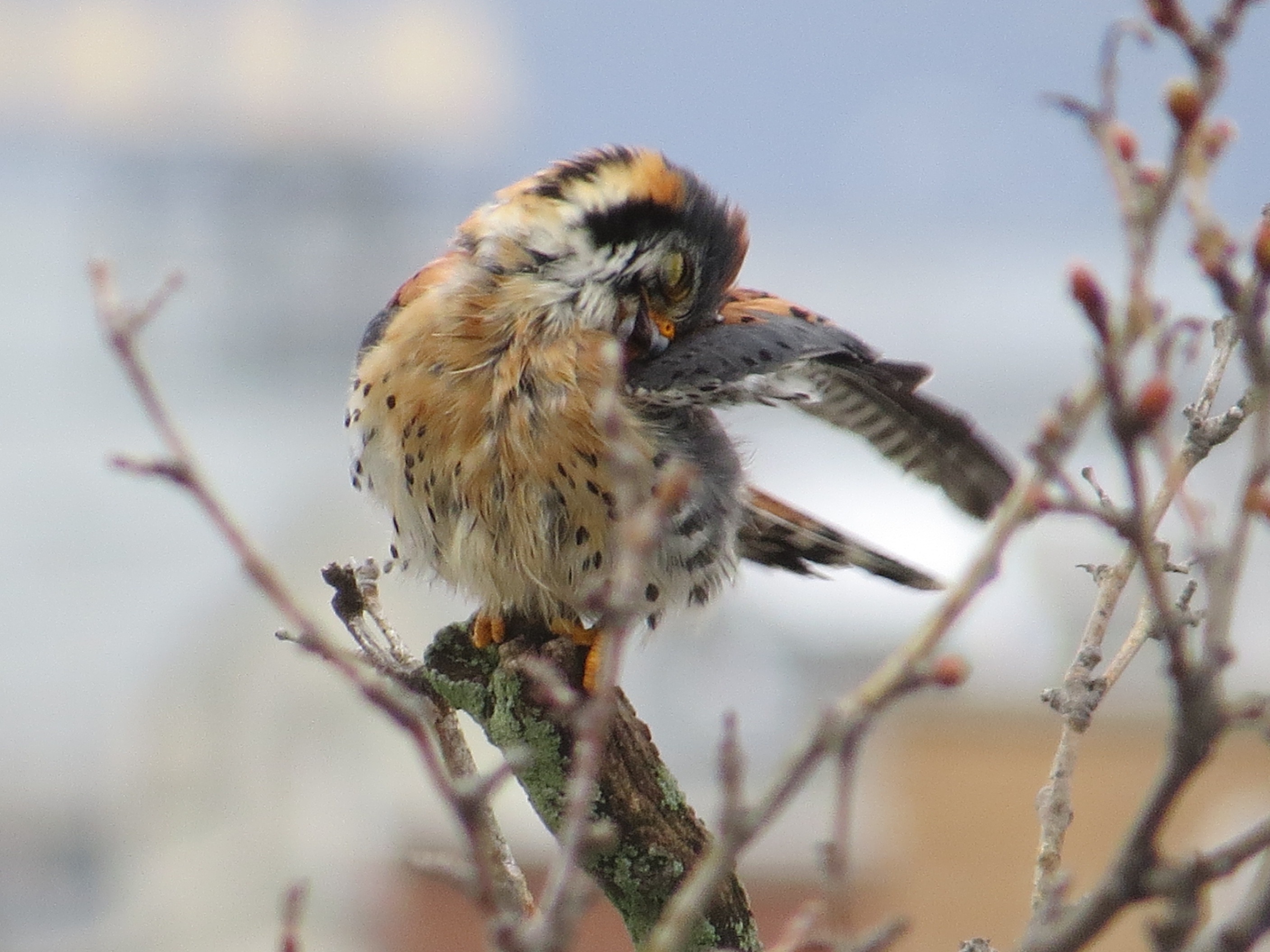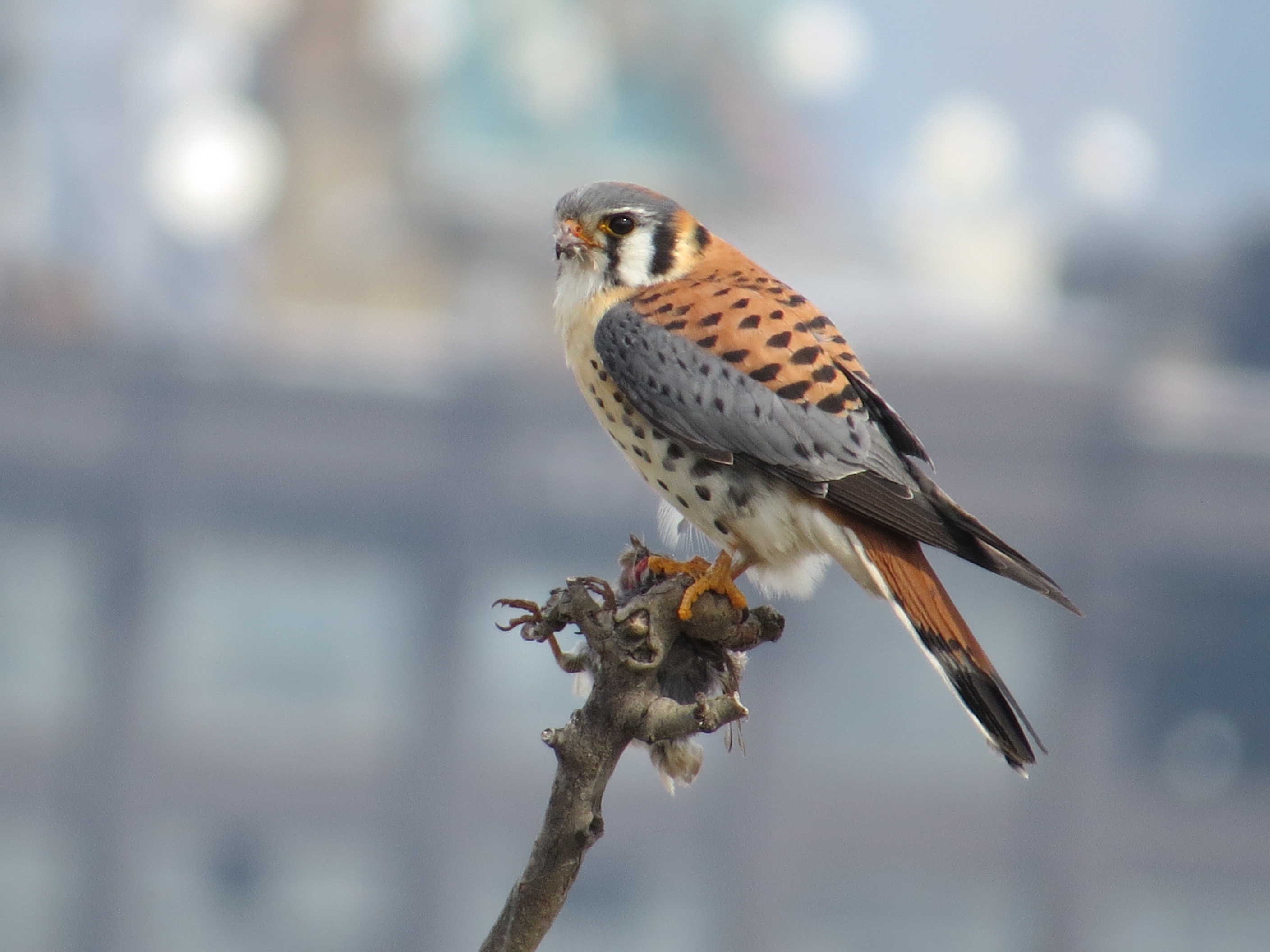 While the male was on the fire escape, he made a noise which I later also heard when he was eating on the antenna across the street. I hadn’t heard this sound before, and can’t find any recordings of it at Macaulay Library. It’s a sort of twittery purr. Most intriguing.