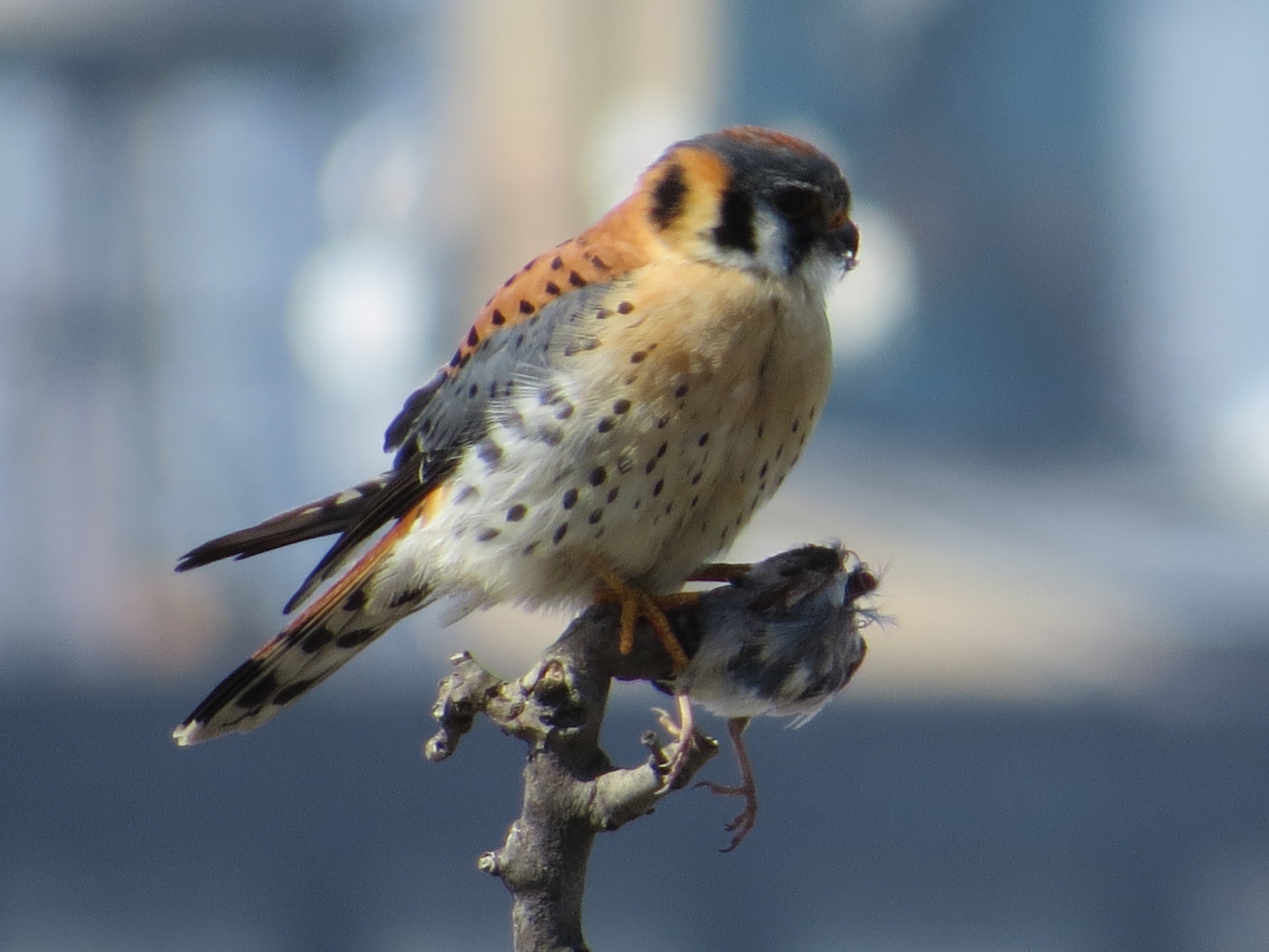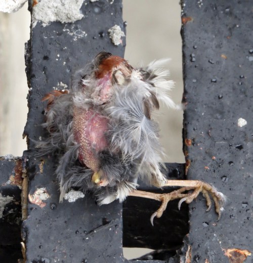 The male has now been spotted on our fire escape three times. The third time he left this corpse, which he later retrieved. House Sparrow, I think: very grey with a feather of rufous or chestnut. It’s dangerous out there! (Four separate bird corpses are pictured in this sequence.)