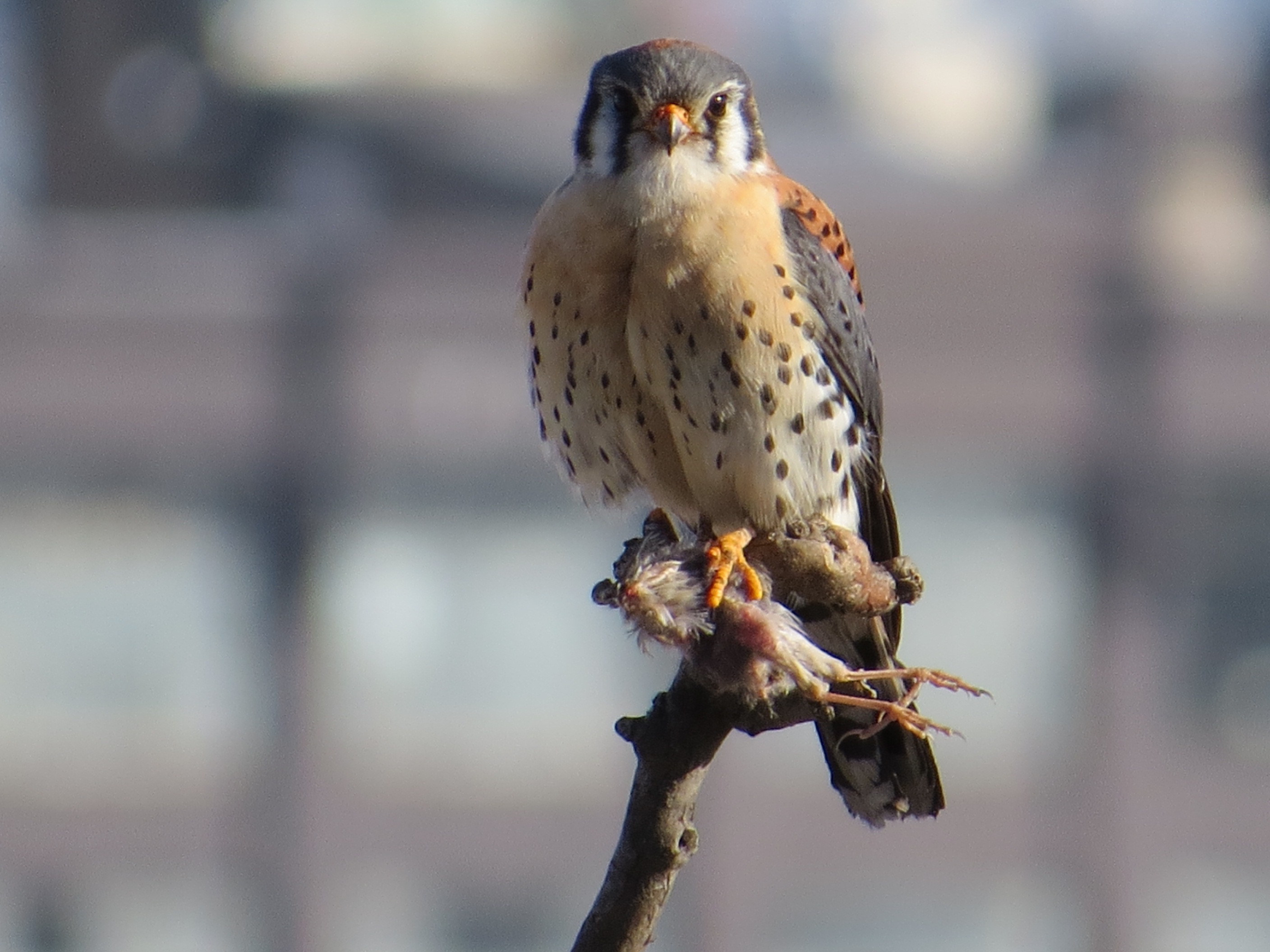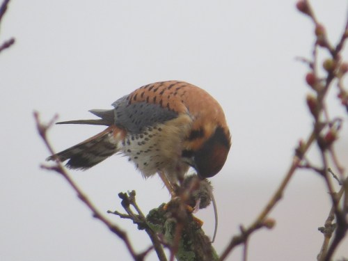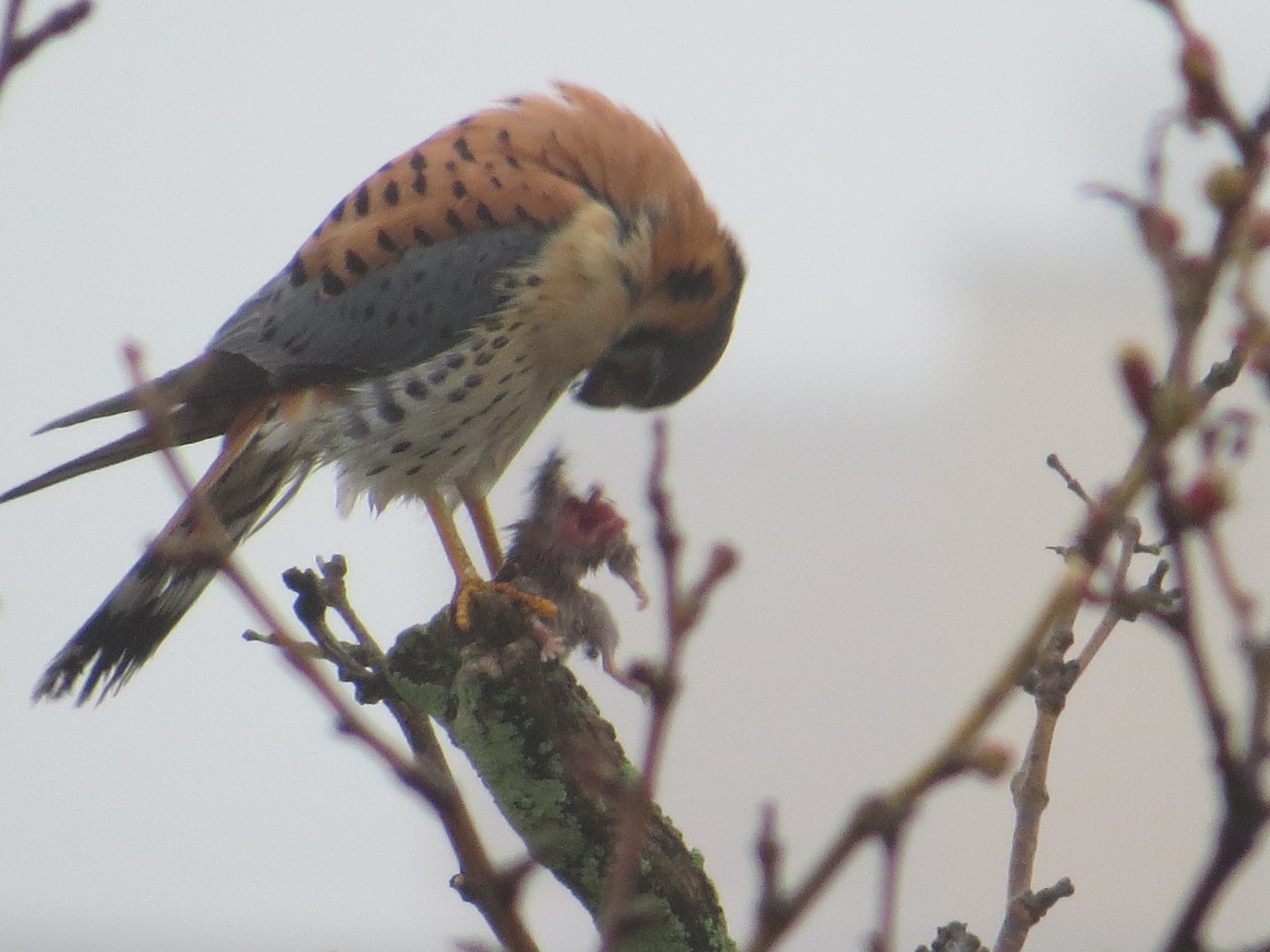 And this is the first mammal I’ve seen either of them eat this breeding season. A young rat? The day before, I saw what looked like a larger rodent scurry towards the curb in broad daylight right across the street from the kestrel nest site. This is a big danger because rat poisons travel up through the food-chain.