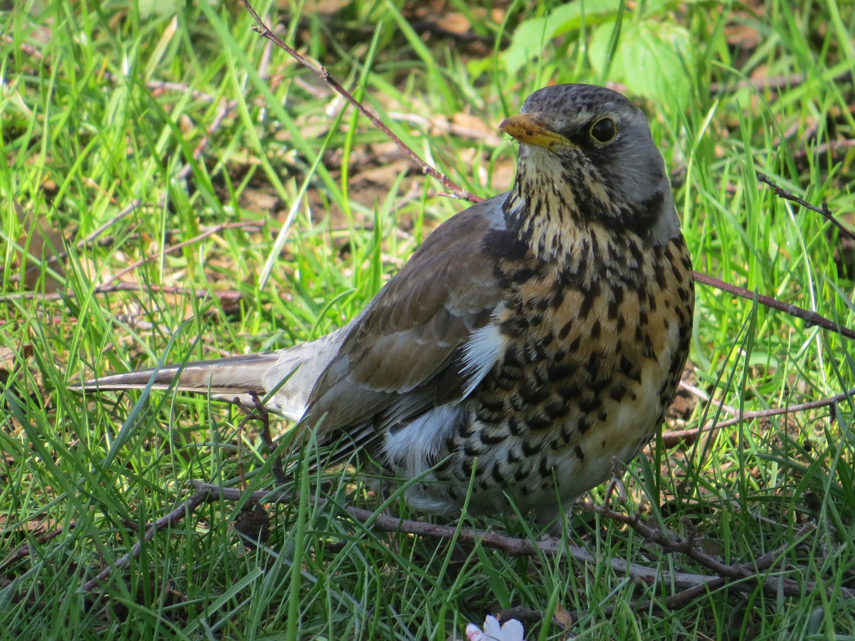 Björktrast. Fieldfare (Turdus pilaris). Like one of our fledgling Robins (T. migratorius) on steroids.