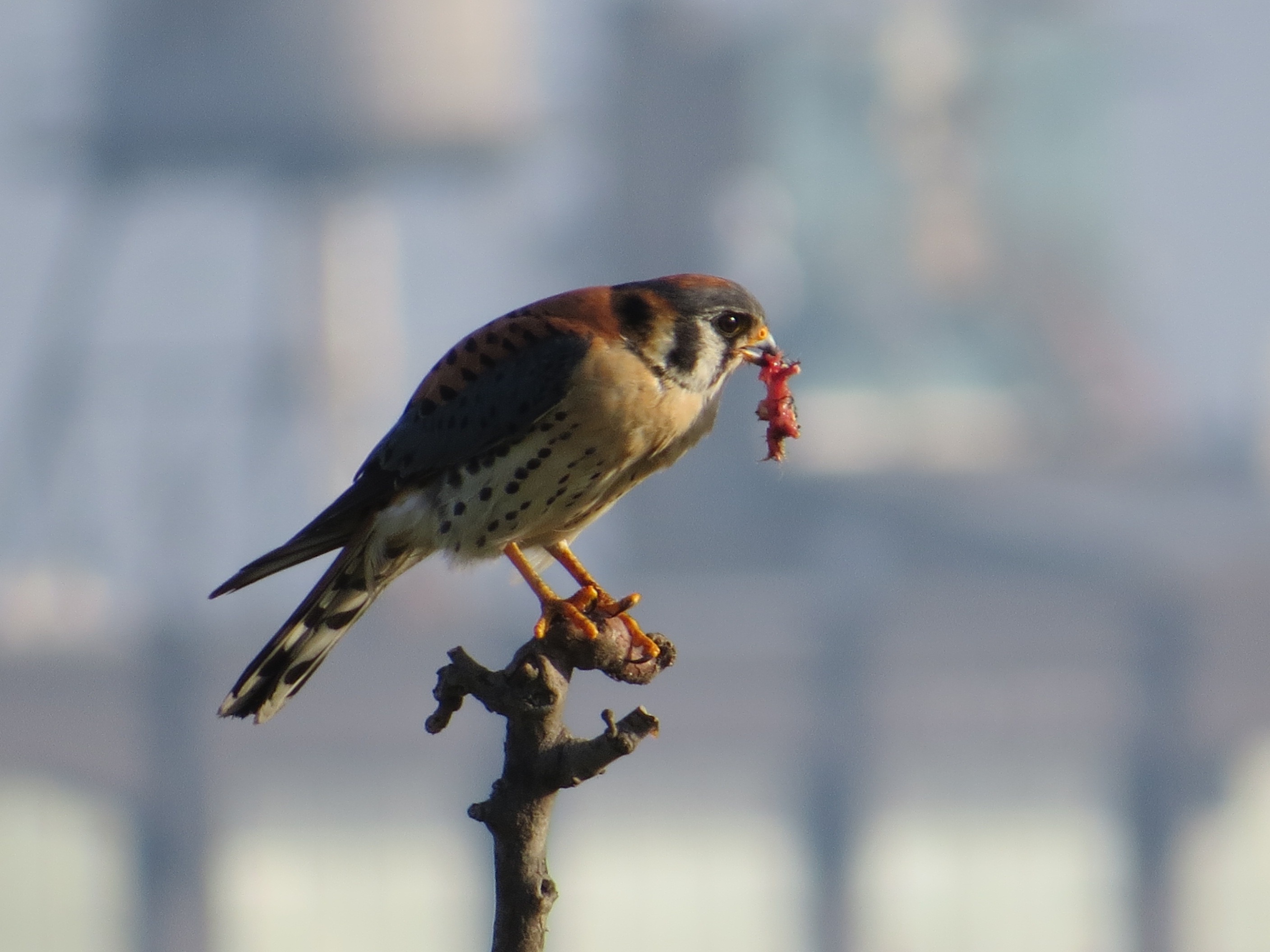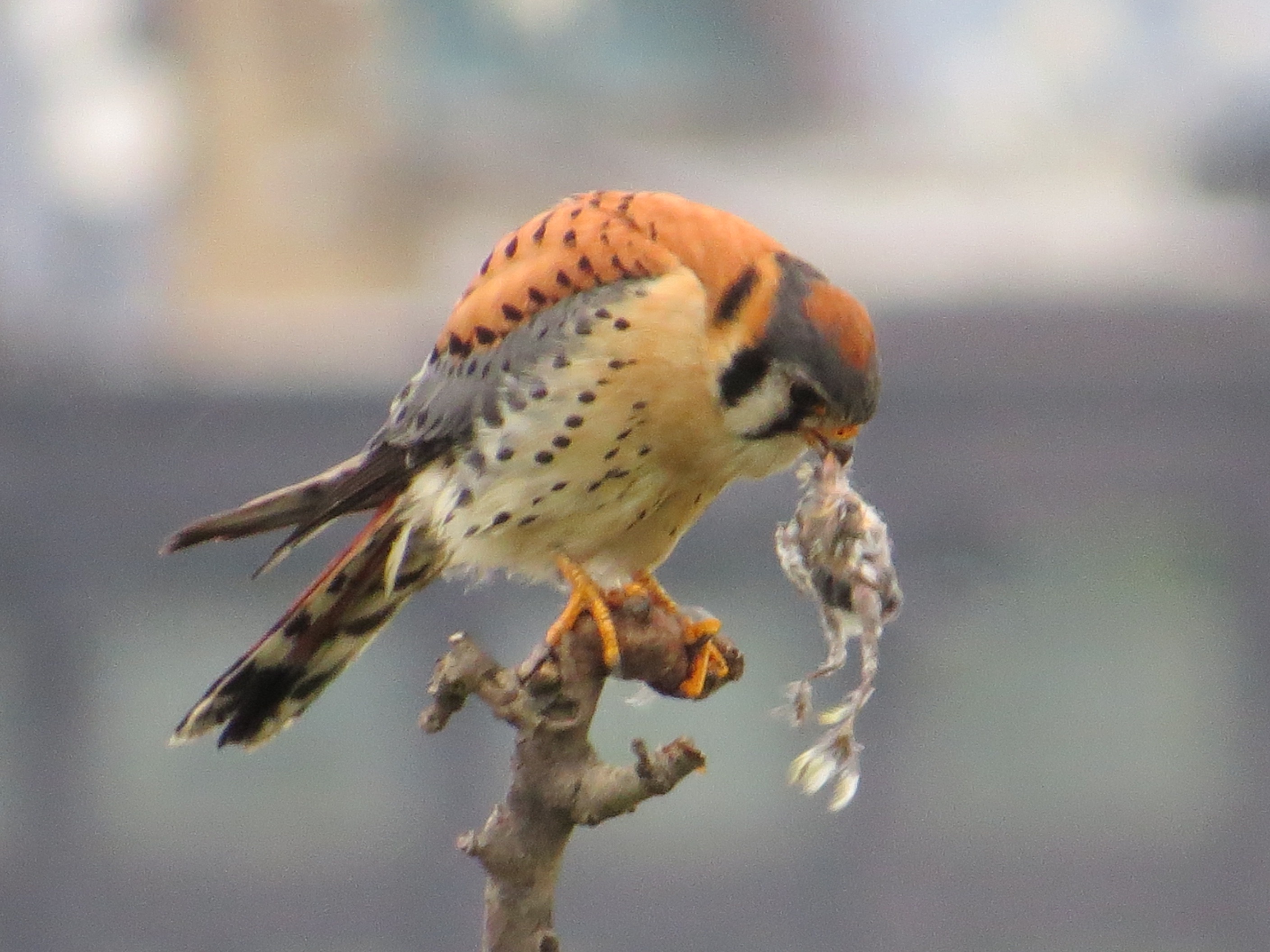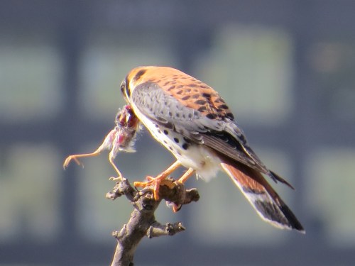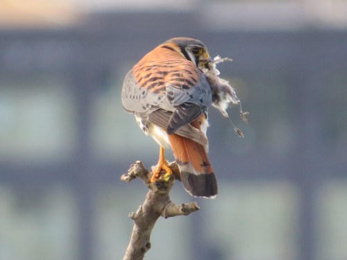 An hour later, the fog had cleared off. This is, I think, the leftovers of the same dead bird. Remember: they cache their food on various local roofs, including, I suspect, mine.