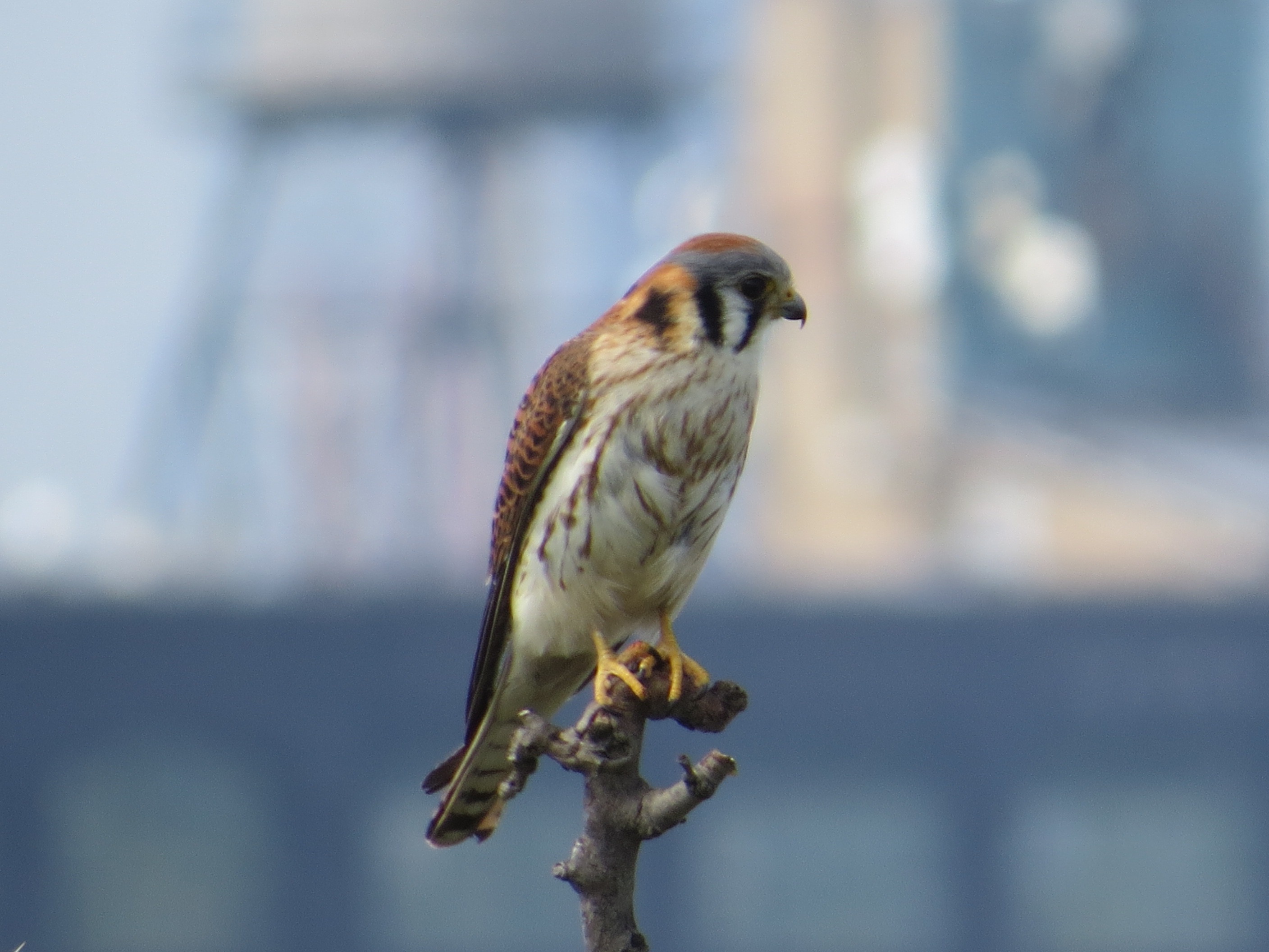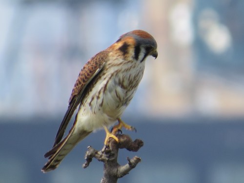 The female is rarely seen these days. She emerges from the cornice nest and flies up to the London Plane on 41st Street to take food bought up by her mate. Here she briefly perches on the avenue London Plane.
