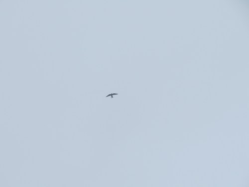 One of the birds, couldn’t tell which one, patrol-hovering after a run-in with a crow. The team don’t want any bad-boys around the nest. Crows have been patrolling the neighborhood for miscellaneous nestlings. They come in very low, one or two at a time. The falcons are furious in response against the rather larger corvids.