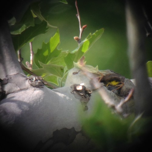 The male of the #BrooklynKestrels pair is stashing prey in a rotted-out knot in his favorite perching tree. This photo is through the screen, rain, and foliage. But with those two little songbird feet sticking up like an amateur gangland corpse disposal, you get the drift.