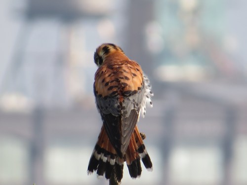 Then he had a piece of head fluff coming off the top for most of another day. There have been almost daily Fish Crow/American Kestrel battles. The crows dive-bomb the falcons and vice-versa. There may be some cache-raiding by the corvids.