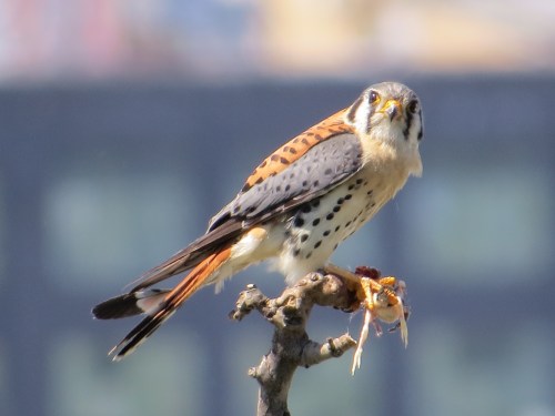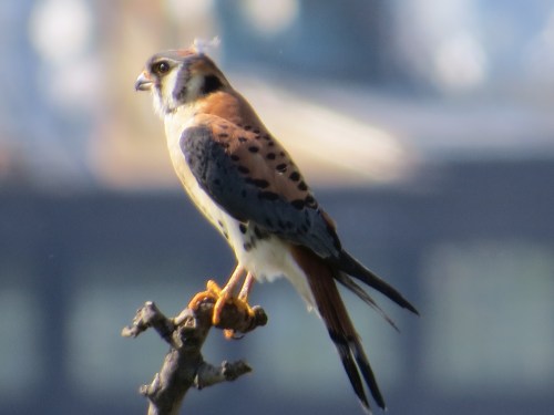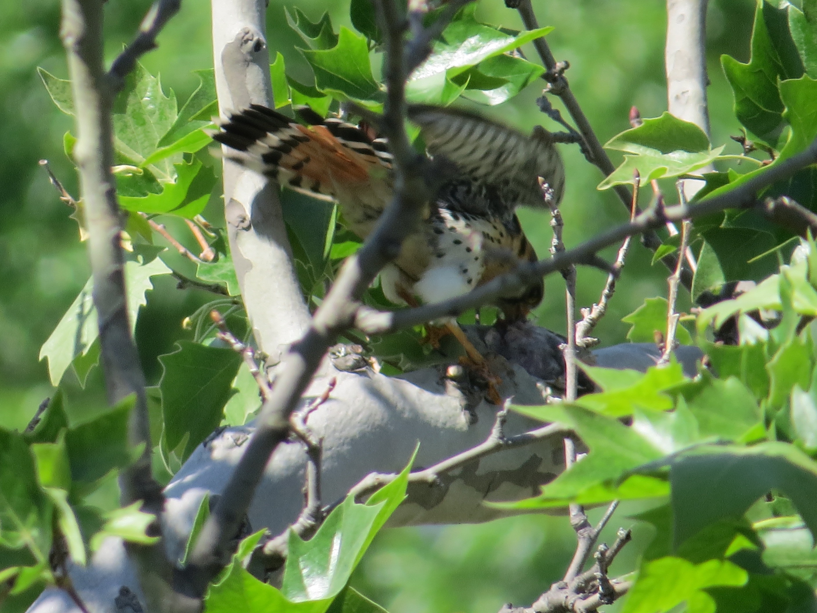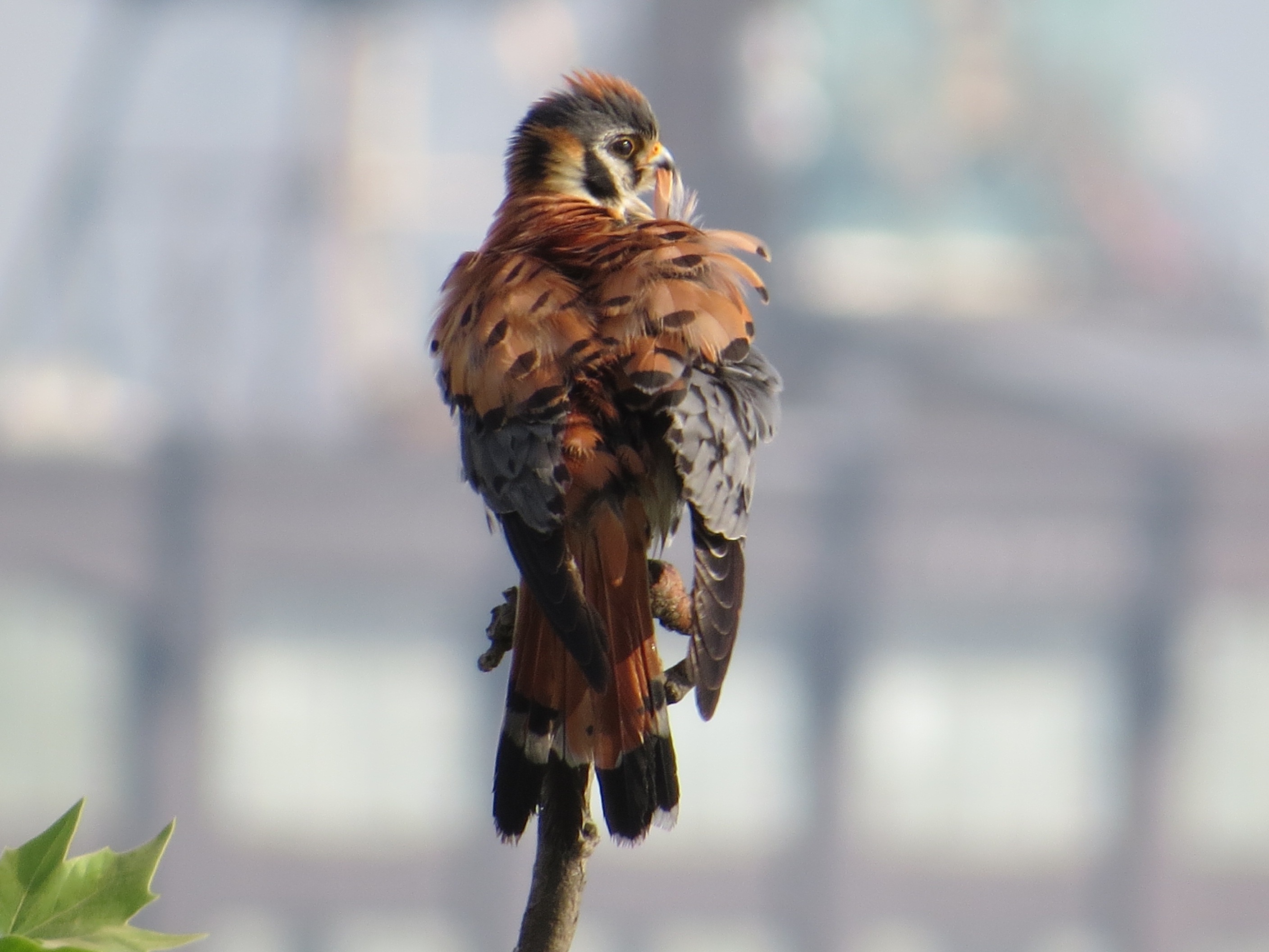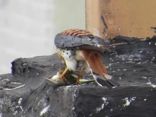 Then he had a piece of head fluff coming off the top for most of another day. There have been almost daily Fish Crow/American Kestrel battles. The crows dive-bomb the falcons and vice-versa. There may be some cache-raiding by the corvids.