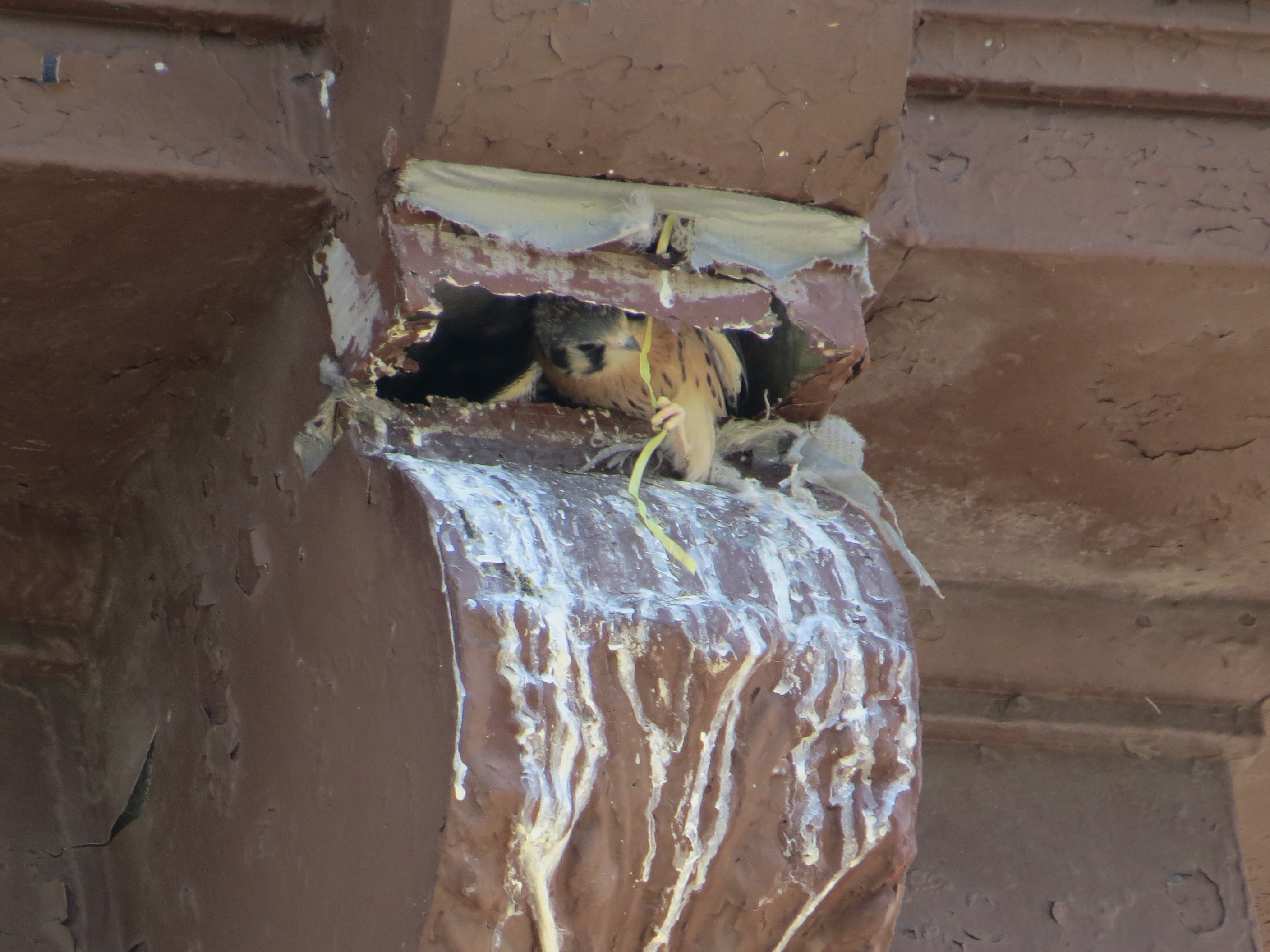 What’s news is I caught a glimpse of a near-fledgling American Kestrel in the corner cornice this afternoon!