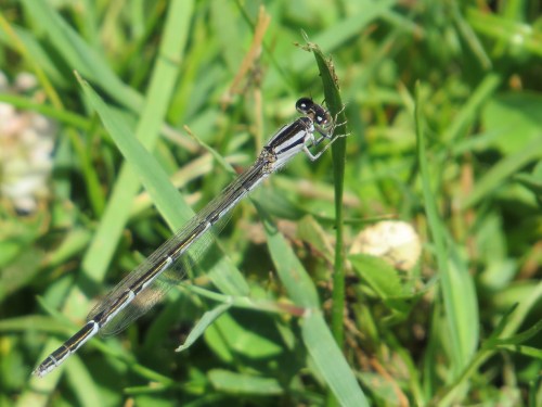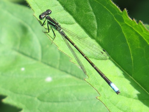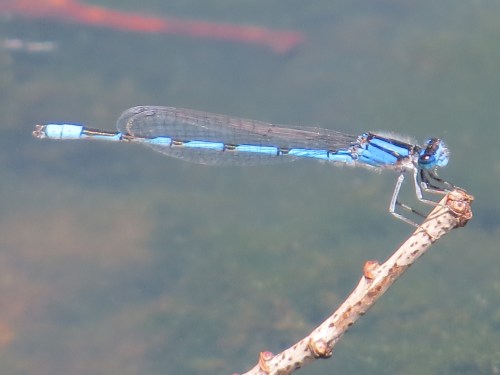 Familiar Bluet female, one of three color forms for this species. When odonating, you will quickly see that it’s males who patrol the water. Females are often munching away elsewhere, and come down to the water to pair up and lay their eggs in the wet stuff.