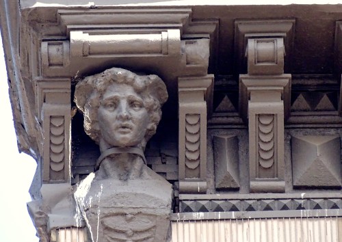 Well, well, well! The Friend of Falcons found the nest she was looking for in Manhattan’s Chinatown. She sent this photo: the nest is in a cavity behind this big cornice bust (note the ample whitewash on the shoulder). One of the nestlings is peaking out (to the left of the bust).