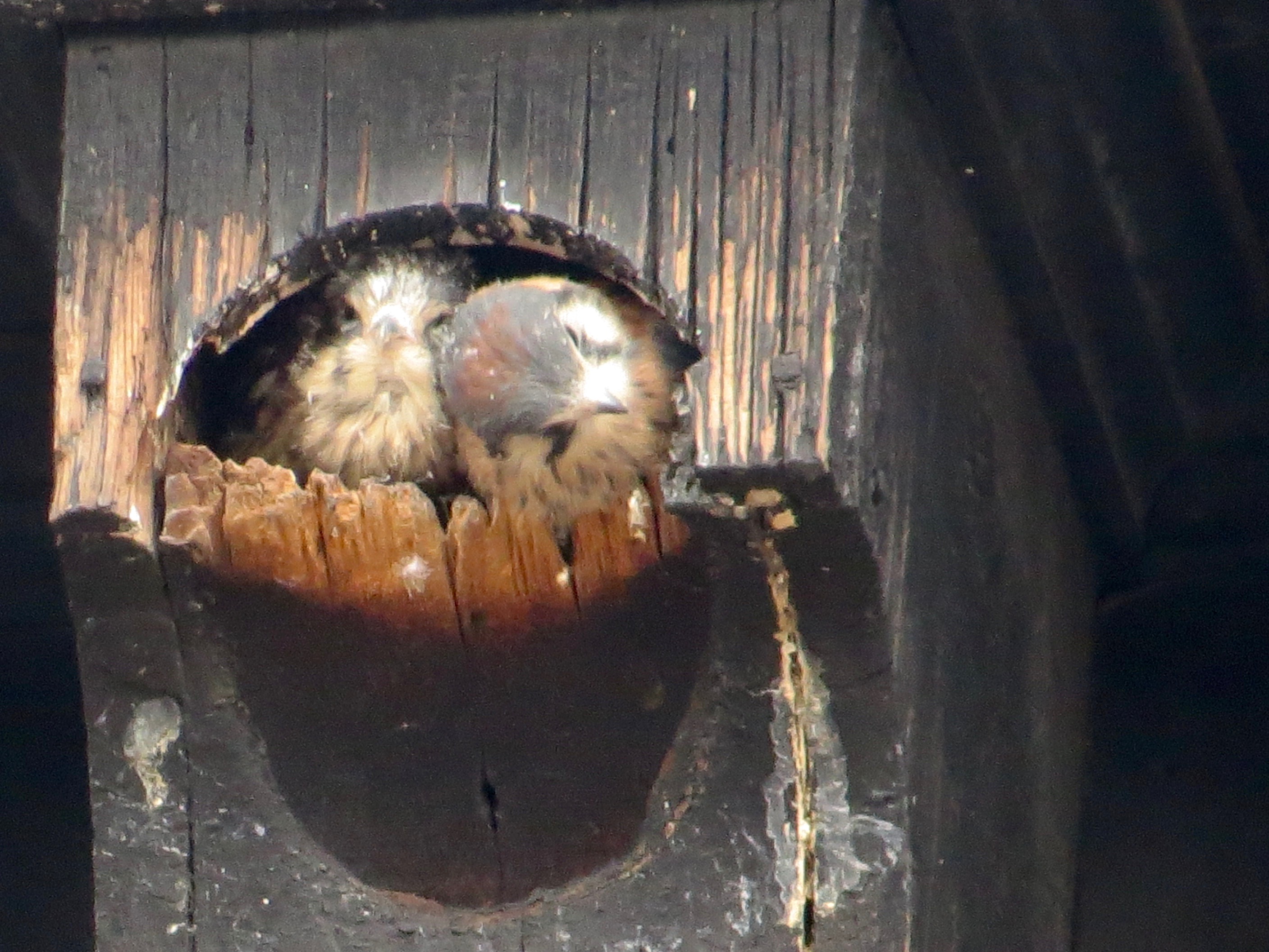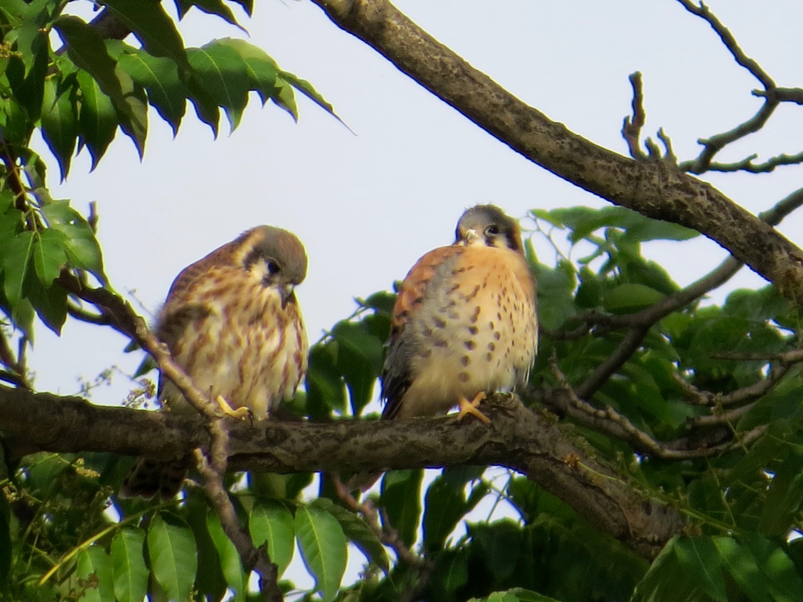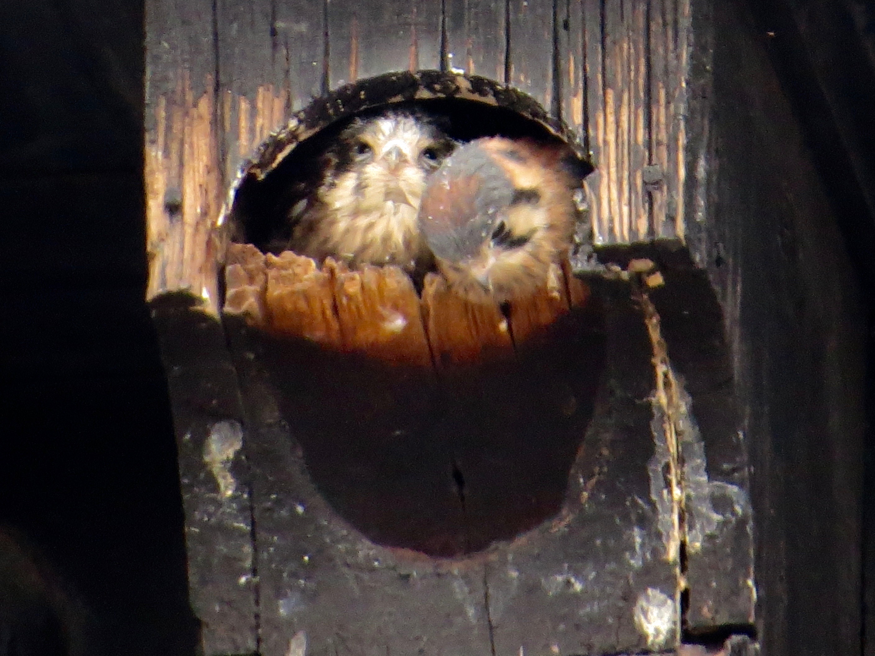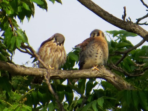 But also cautious. Flying is hard, hunting is hard, living is dangerous. Back at the ranch: youngsters under the sheltering fronds of the ailanthus. Our neighboring #BrooklynKestrels seem to be the oldest of these three nest sites. (I didn’t see the bird in the top right corner until I looked at the picture later.)