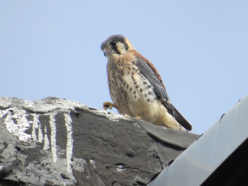 The American Kestrel puppies are flying fast and furiously around the city. On Sunday, at least one had fledged successfully from the Park Slope cornice. He’s on the roof right above his natal cavity.