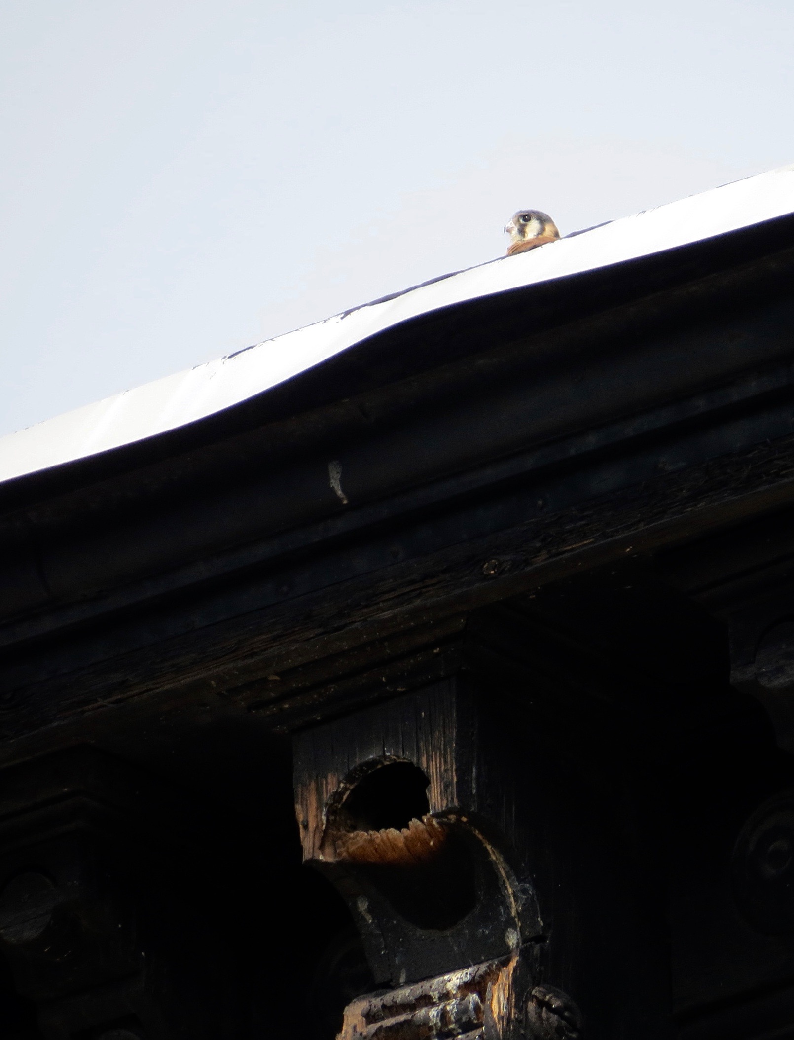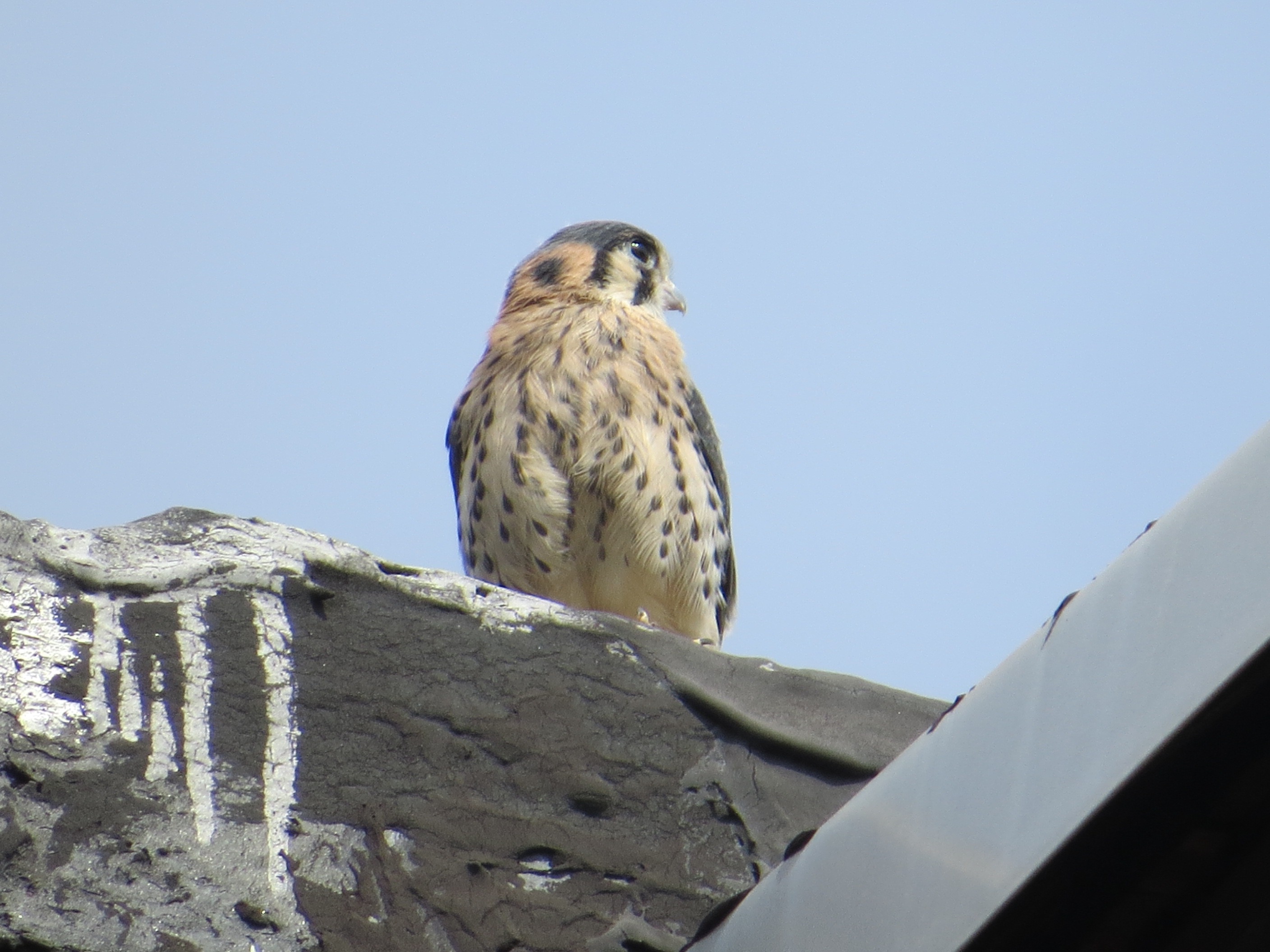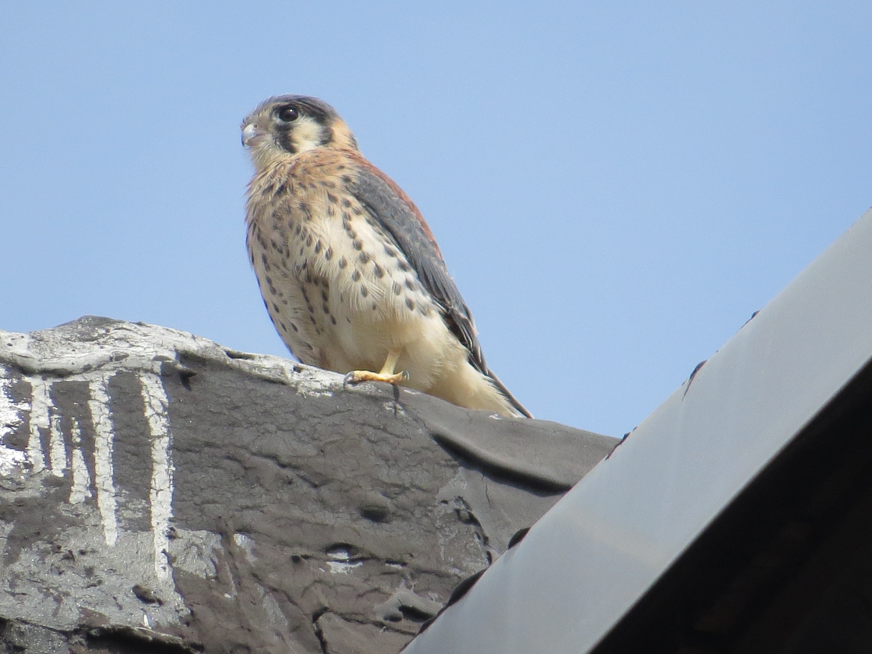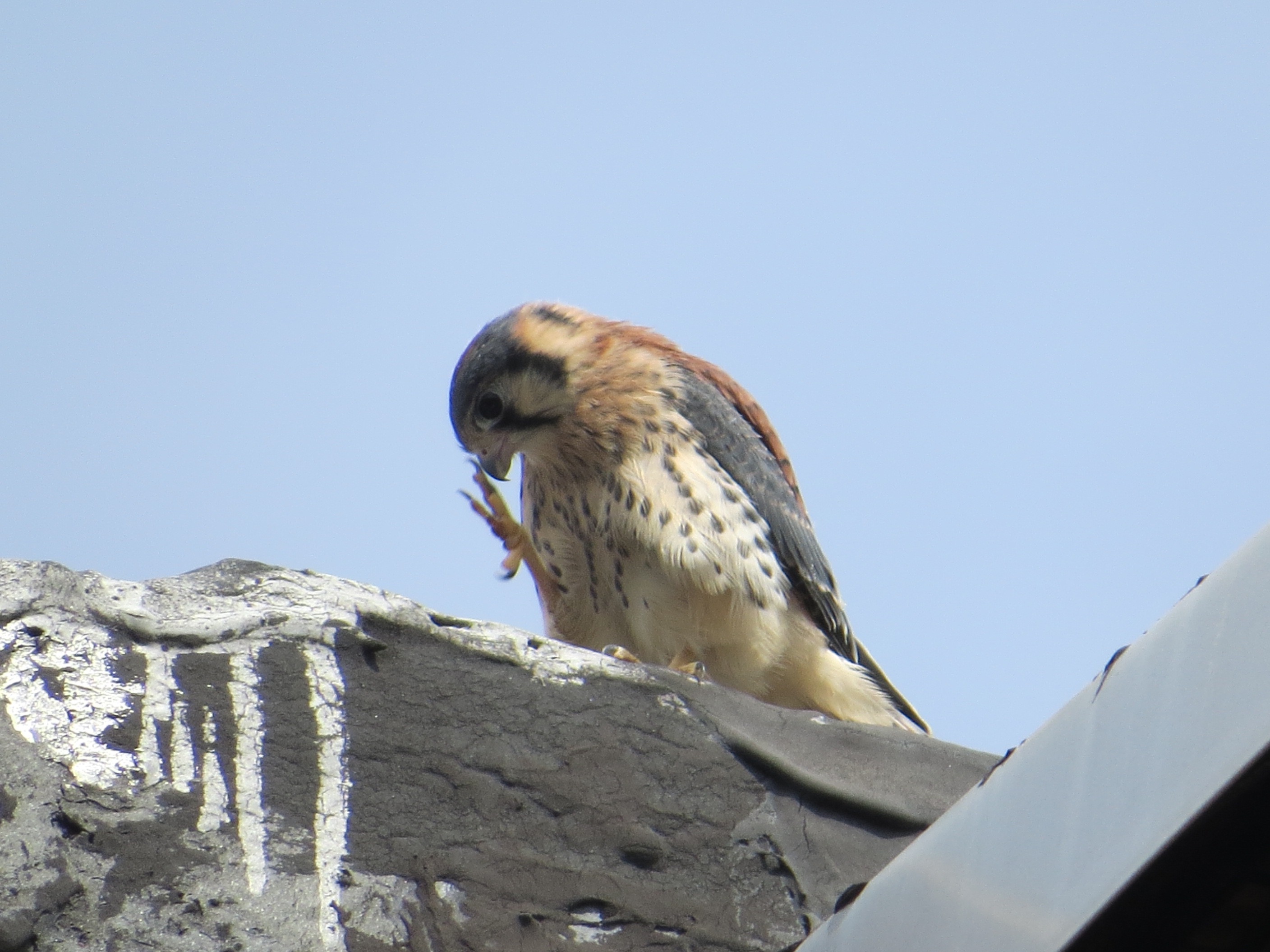 The American Kestrel puppies are flying fast and furiously around the city. On Sunday, at least one had fledged successfully from the Park Slope cornice. He’s on the roof right above his natal cavity.