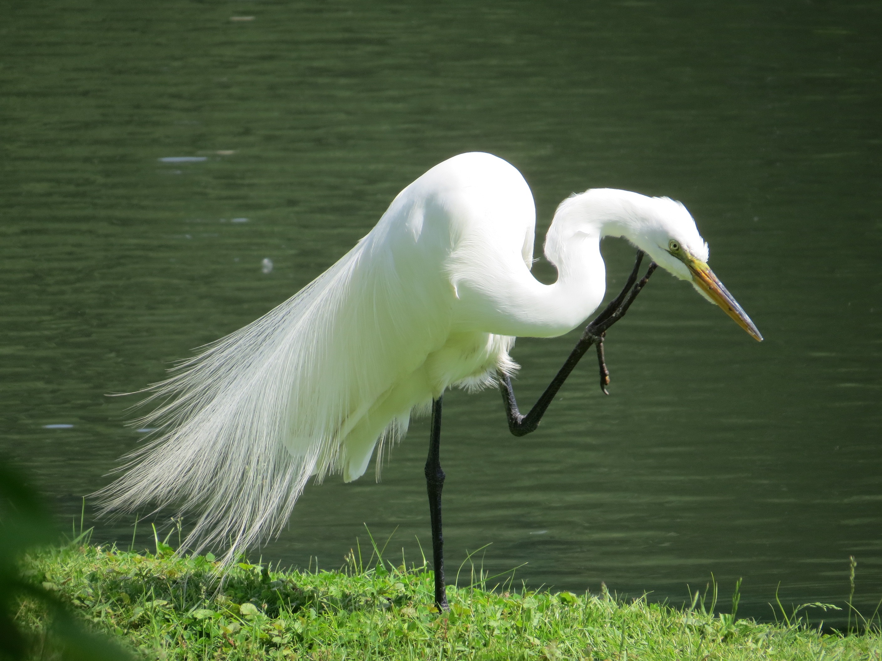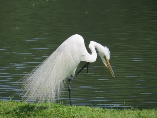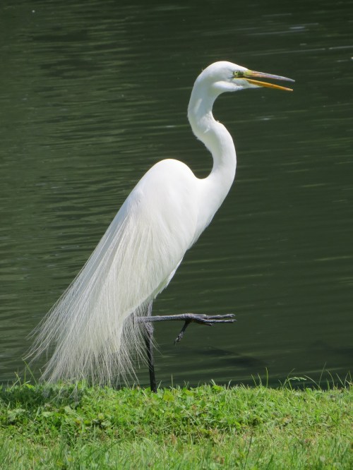 These long breeding plumes, known as aigrettes, were one prized by the fashion industry. (An industry as ugly in the 1890s as it is now.) Great Egrets were slaughtered wantonly for their feathers; since these feathers are breeding plumage, the birds would be shot during breeding season, condemning the next generation in egg or nest to death, too.