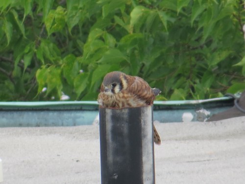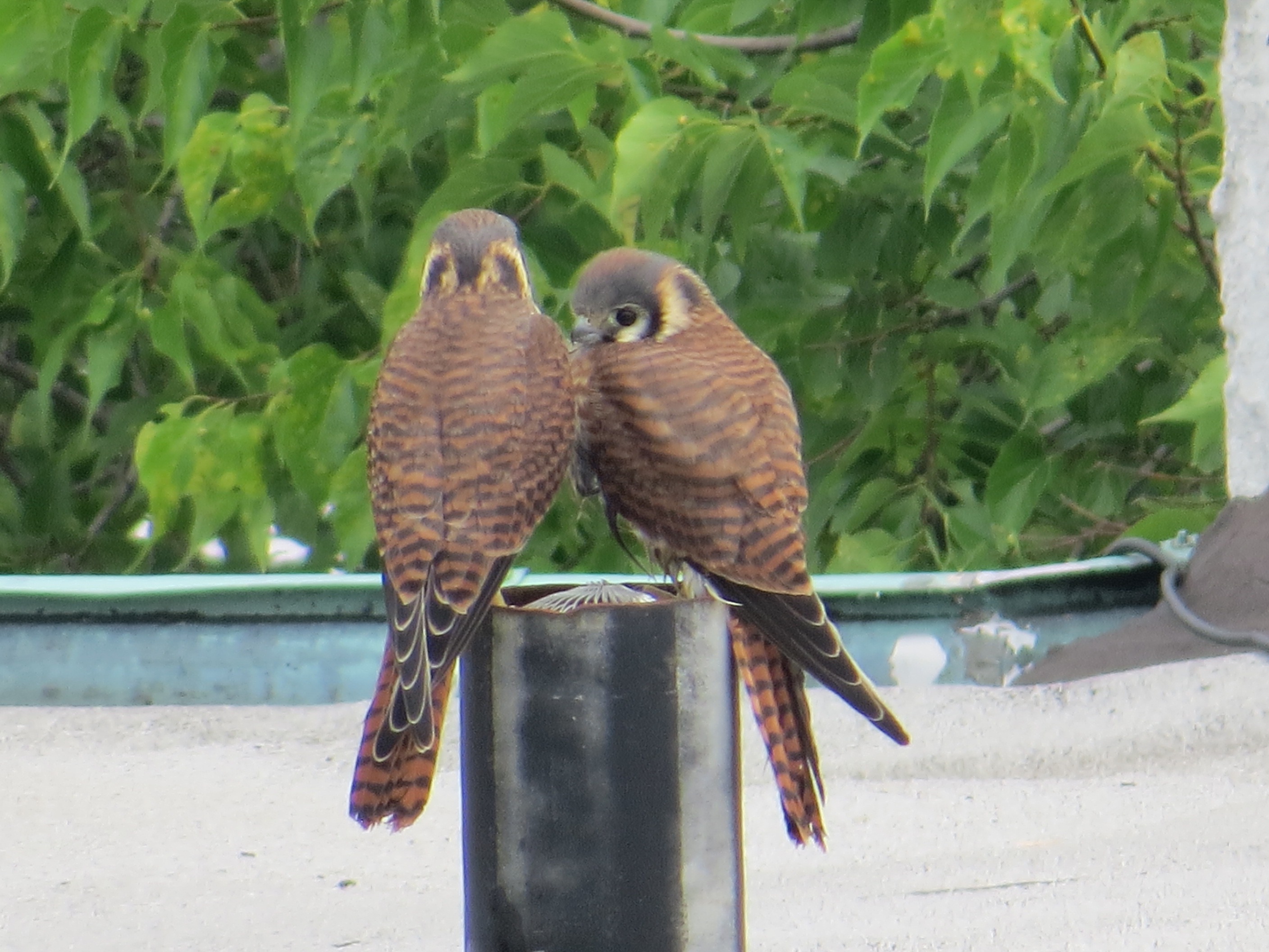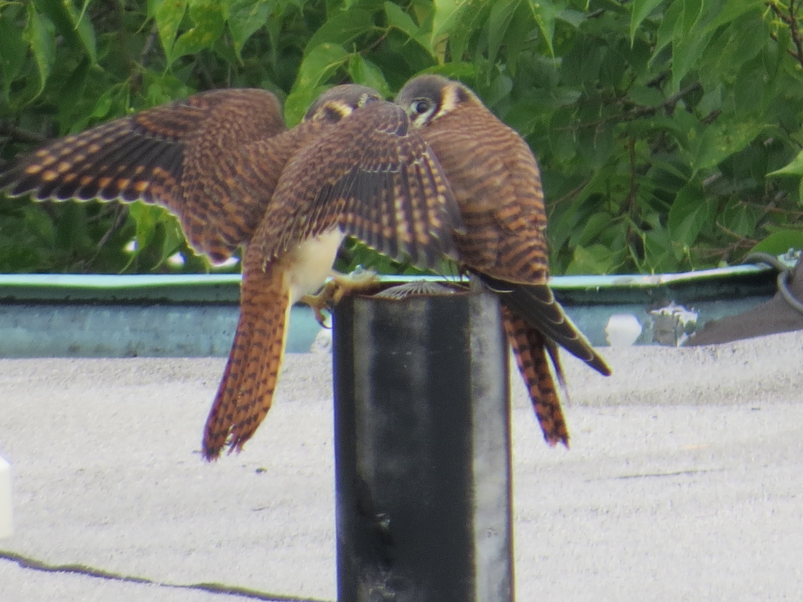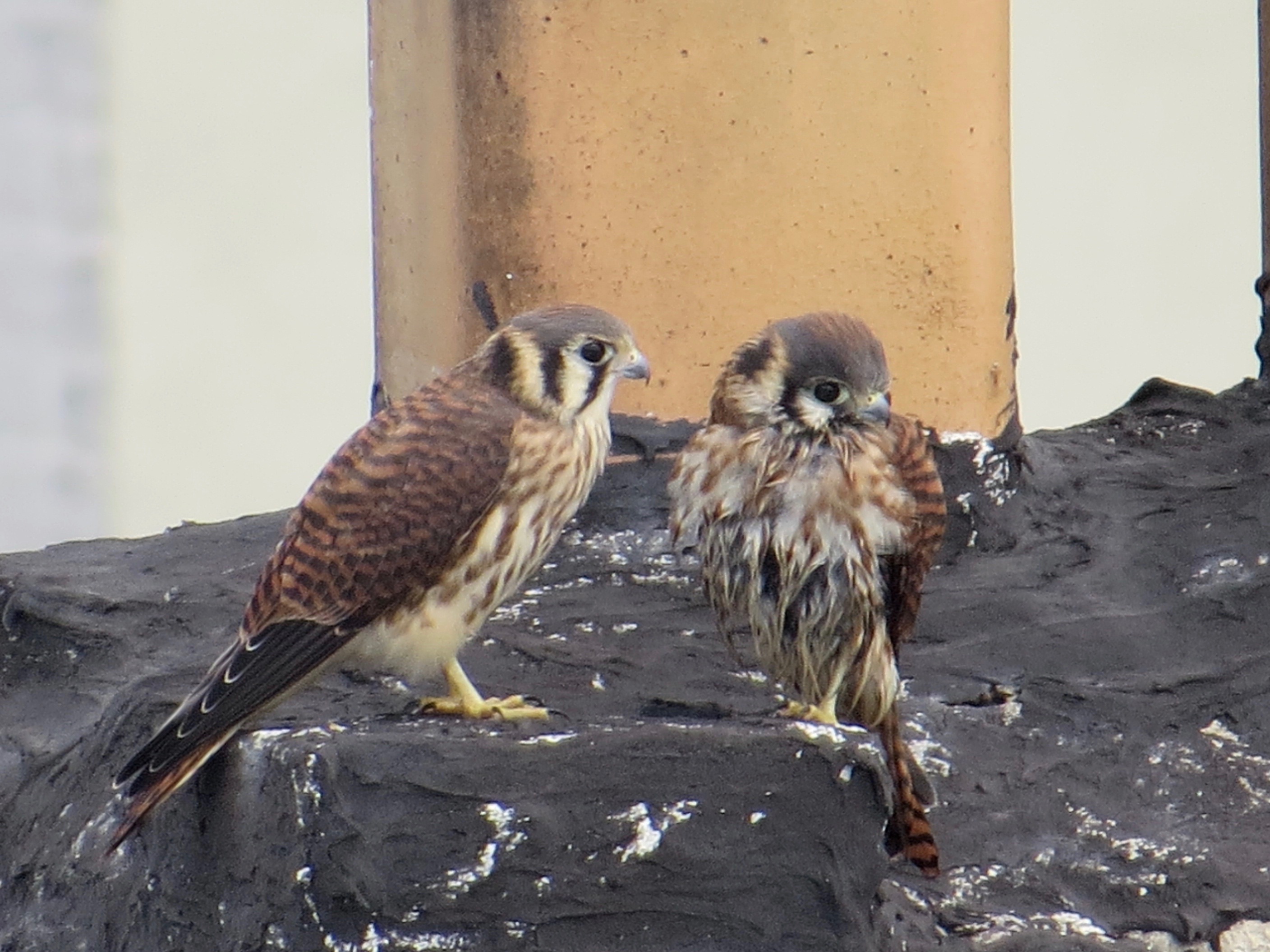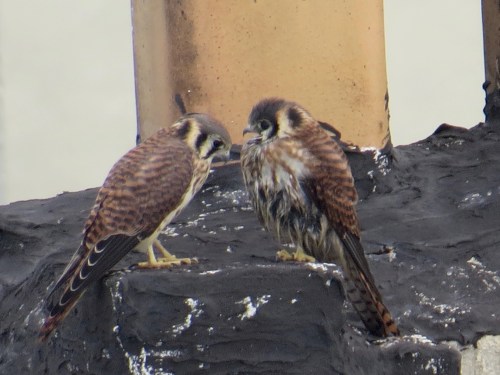 Because a third female was perched in the distance at the same time. I think this is the mother. She’s gone back to old haunts on the solar building. The male adult seems to be on the big antenna again a lot, too.