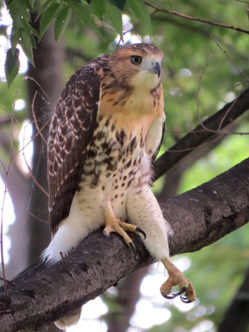 The apricot/salmon flush to the breast is a sign of youth in Red-tailed Hawks. The feet are signs of raptor.