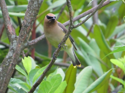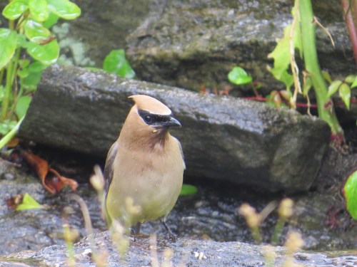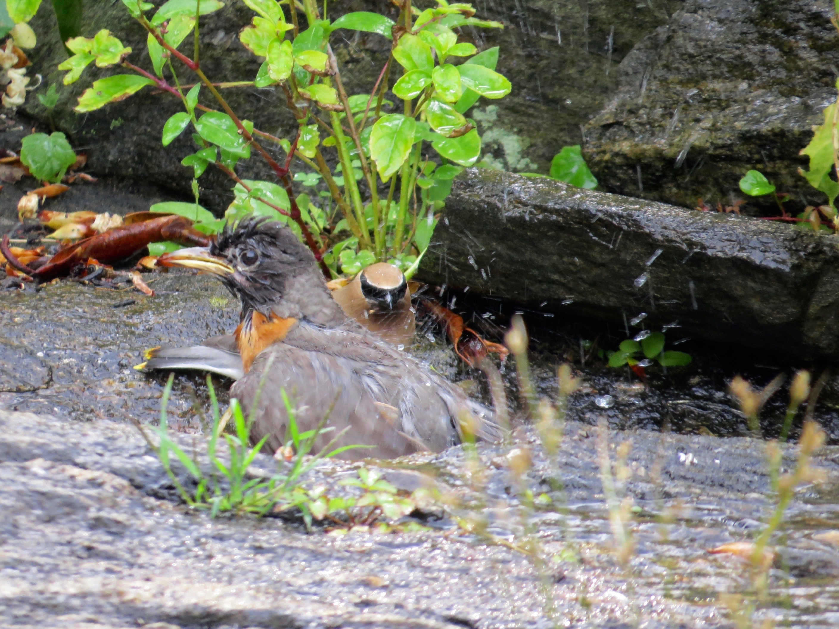 I didn’t have my camera with me, so recent run-ins with three young rabbits in the Bronx went unrecorded. Each of them was festooned with ticks, around the ears, face, and neck. Some of the ticks were hugely bloated, looking like malignant gumballs or creepy purple pearls. A few days later, armed again with lens and digital thingamajibbles, I caught this Cedar Waxwing at the communal bath.
