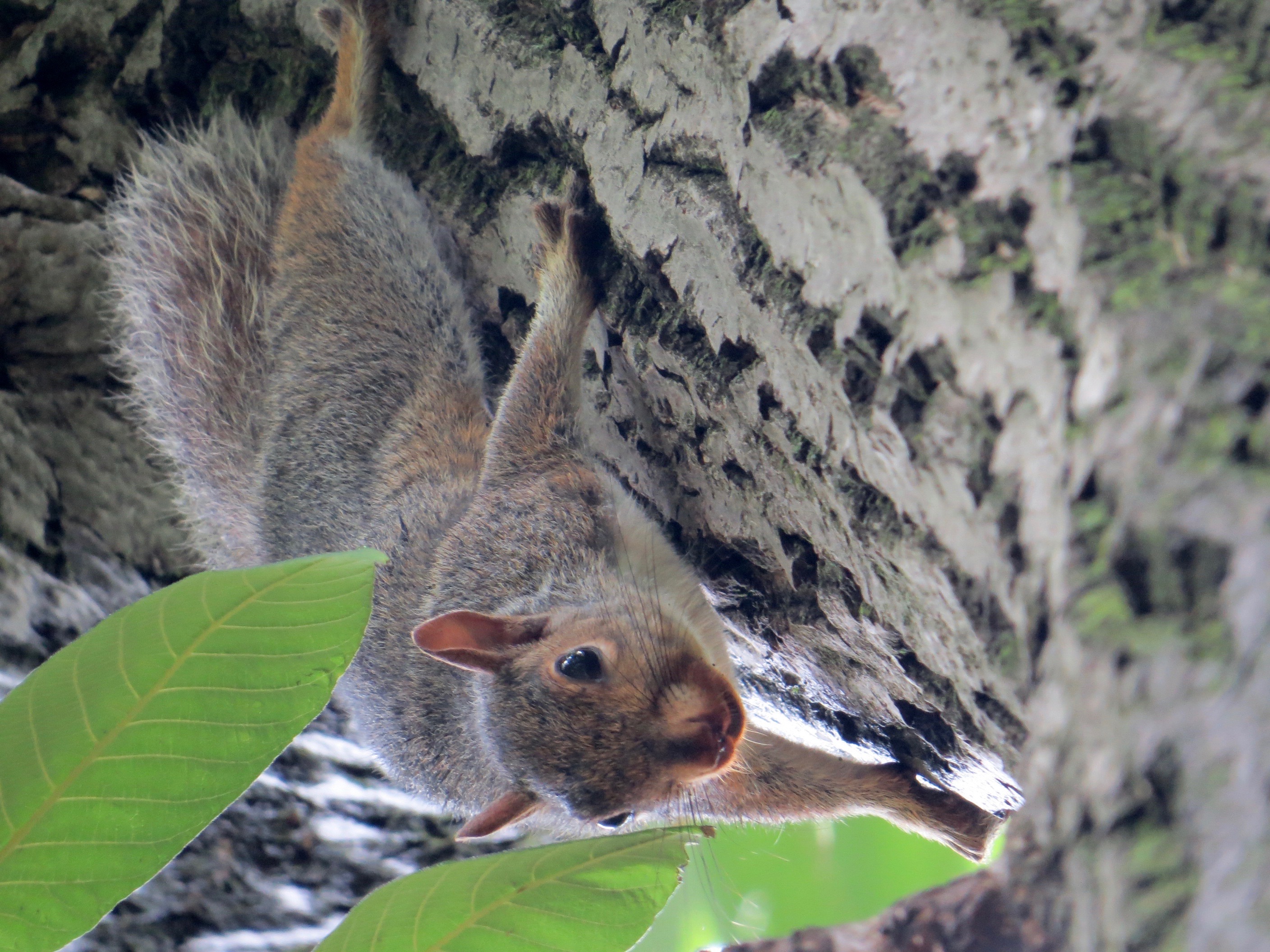 Half a dozen Greys were around or up inside this tree. (Some kind of walnut, I think; fruit looked pecan-y but leaves didn’t.) Also I wasn’t sure if the nuts raining down upon me were intentional. Poetic fallacy and all.