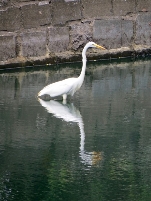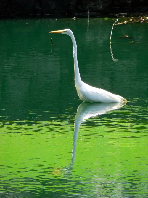 The Great E hunted right up its belly. The bird grabbed three small fry. The frogs, however, were jumpy; they leaped long before their nemesis was in range. Then, splash-whiplash! A six inch koi was in this bird’s saber bill! This got the Great Blue’s attention. Memories of being feed not so long ago? The youngster flew across the water, flushing the Egret out of the sunken pond. The gold fish went down quickly. Both Ardea stalked along the edge of the pond.
