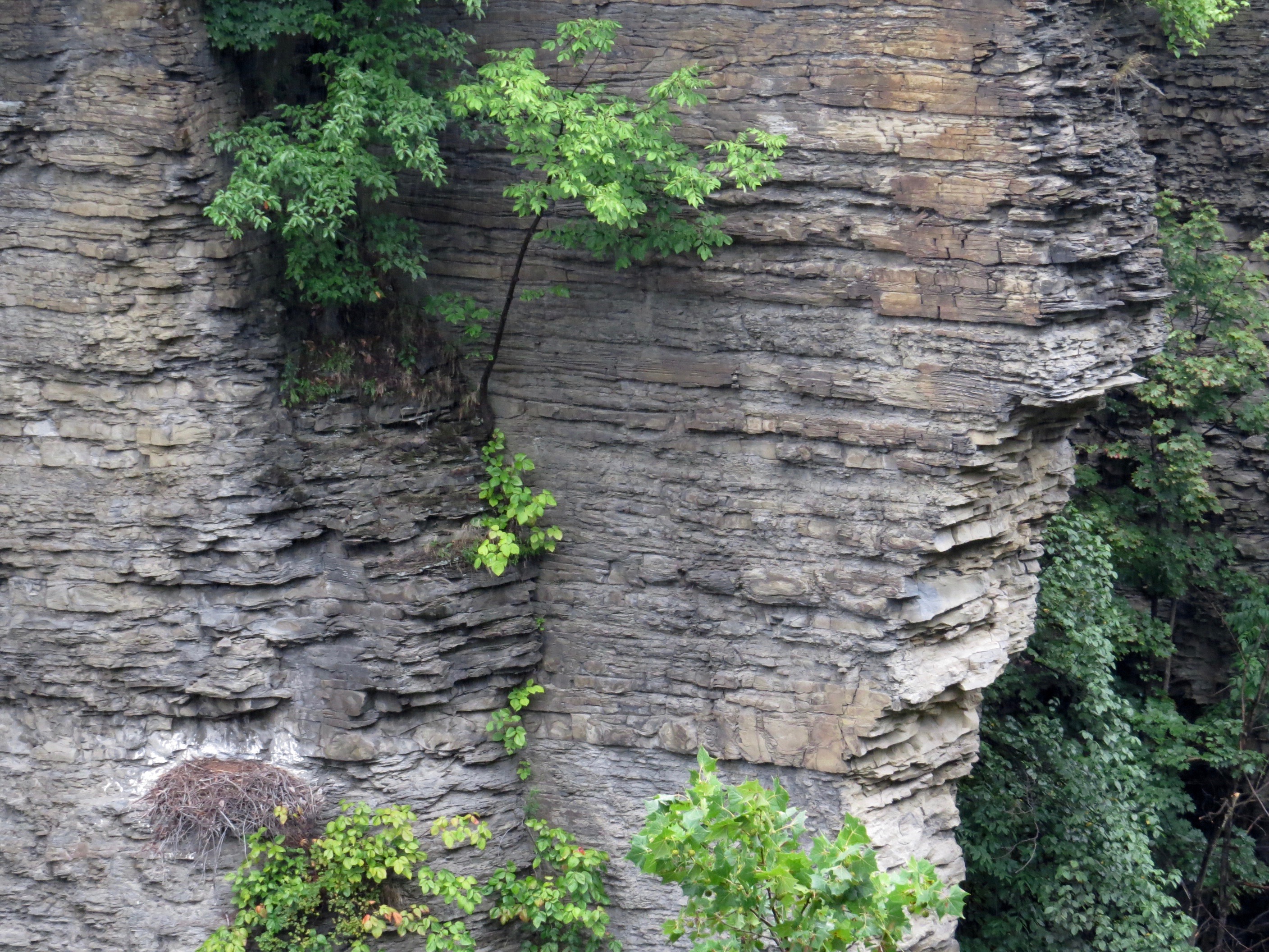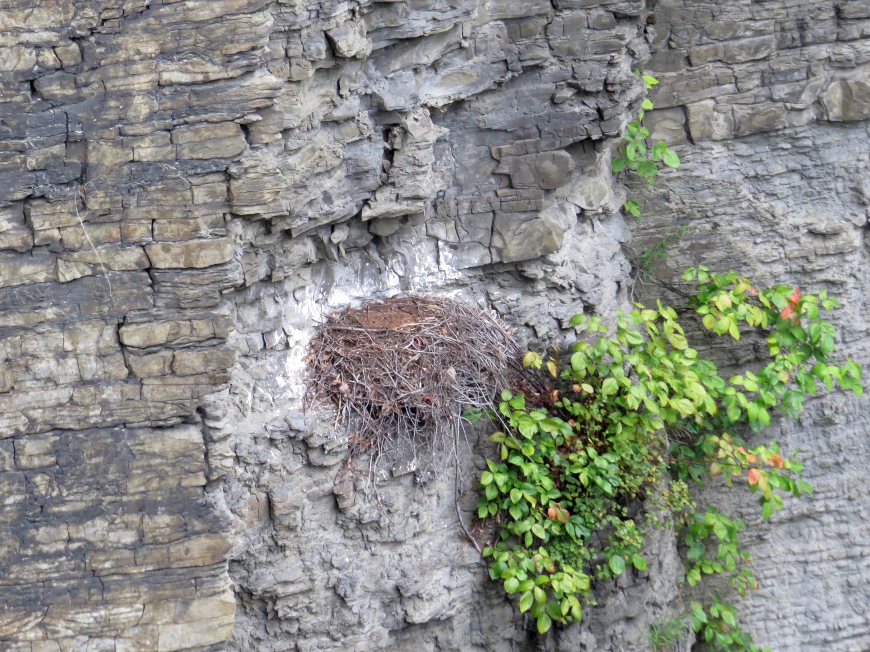 At the Stewart Street Bridge over the Fall Creek gorge, I noticed this nest in plain view. Further research revealed it to be a Red-tailed Hawk nest….