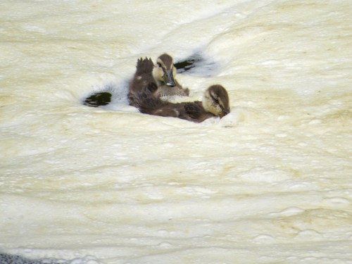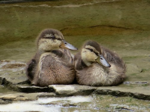 These two ducklings, still with stubbs of wings, swam against the flow of tumbling Fall Creek to team up with their mother on another rock.