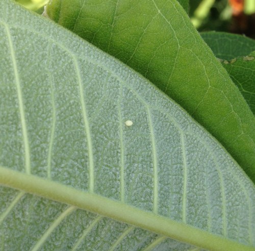 Nearby, an adult female seemed to be laying eggs. Here is one of the tiny things (I think). Will this egg open up to a caterpillar that becomes a butterfly that flies to Mexico this fall? The odds are against us, but you never know. Hope is a tiny egg on the underside of a leaf.