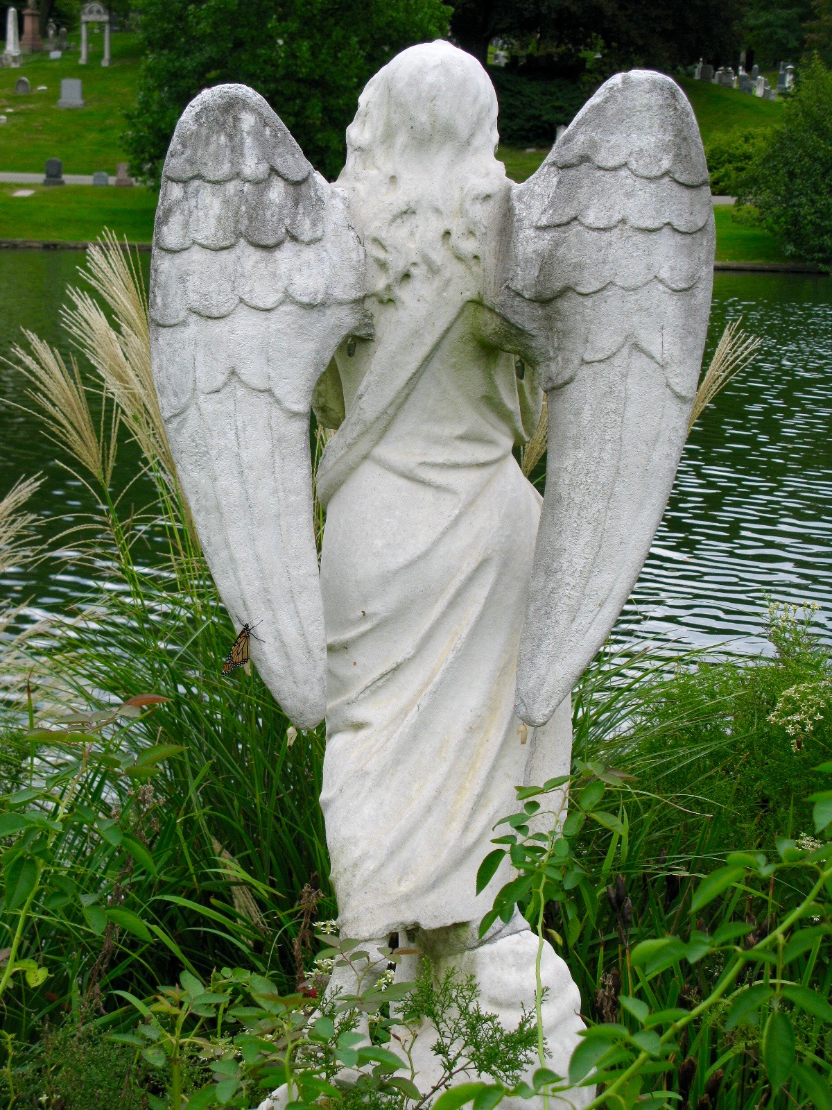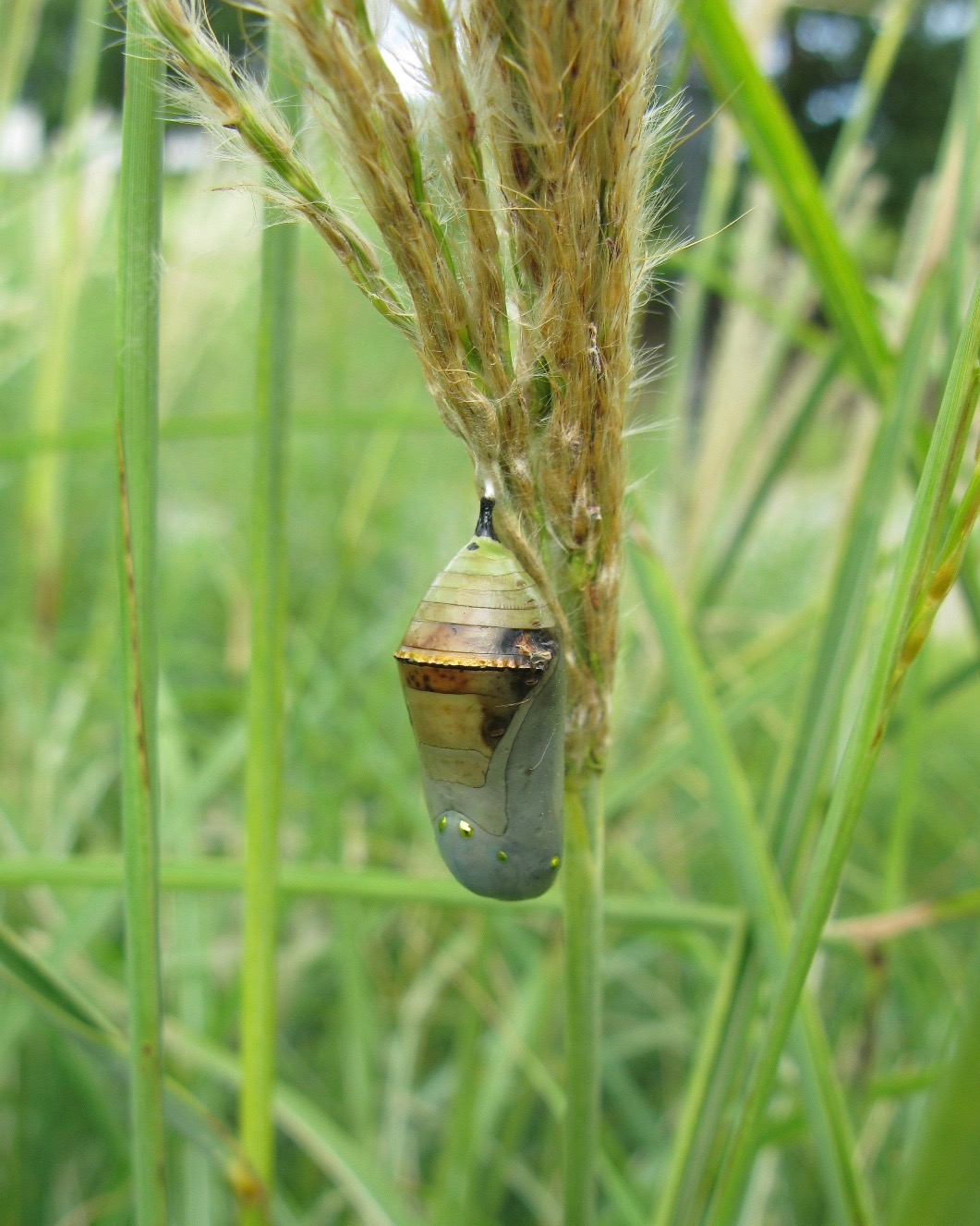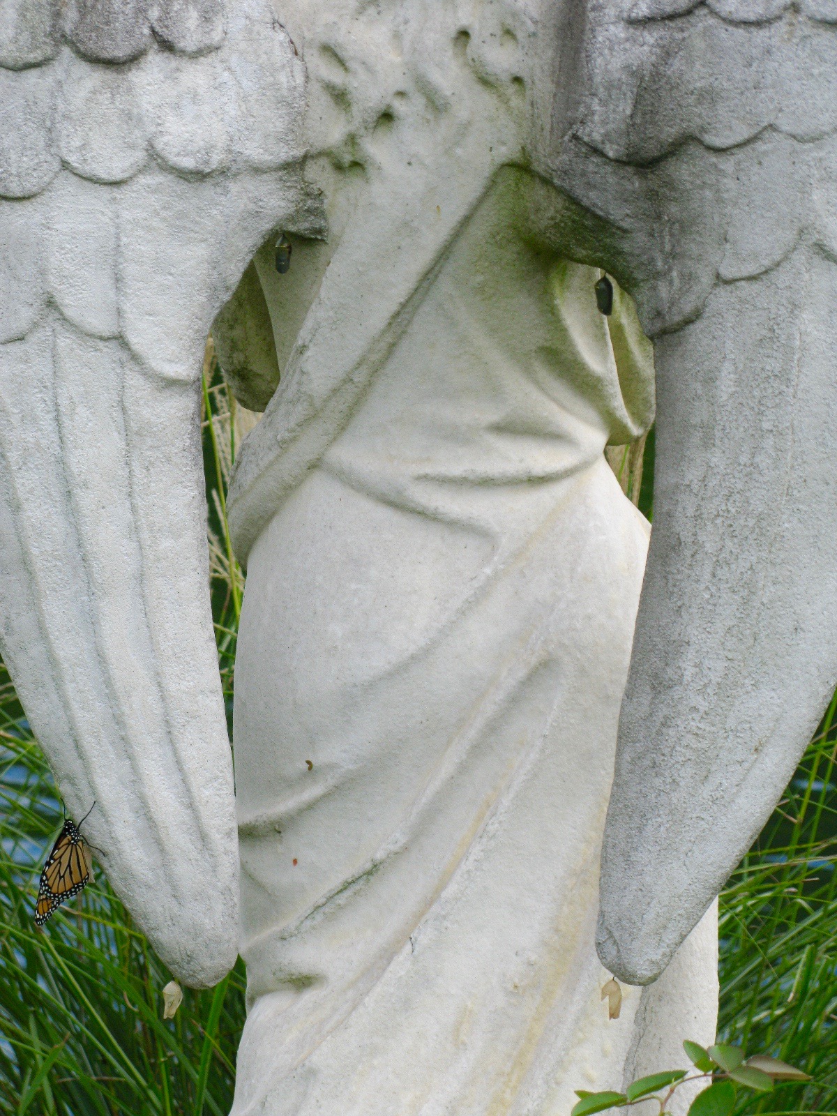 Under each wingpit, a chrysalis. At the tips of the wings, emptied husks of chrysalises. On the left wing, a chrysalis and brand new Monarch. Harder to see, but way down below the drape of rocky dress, another ripening chrysalis.