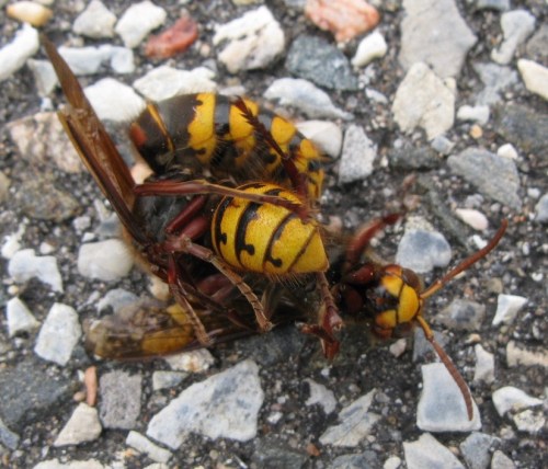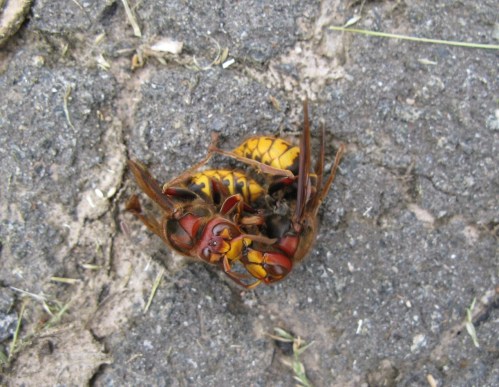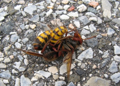 These two European hornets were locked in mortal combat. Bugguide.net says they’re females. Were they from different colonies, fighting over a food source? This was right next to a compact but rich hunting ground of Buddeleia swarming with butterflies, skippers, and bees.