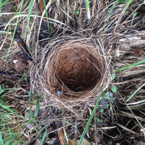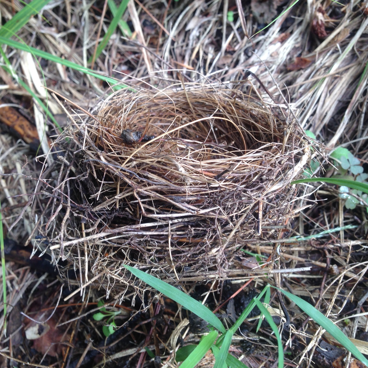 Underneath a pine, probably dislodged by the fierce rain of the day before, summer’s nest. Quite small, about 3.25″ across, but certainly not the smallest I’ve ever seen. That would be the absurdly tiny, lichen-camouflaged nest of the Ruby-throated Hummingbird.