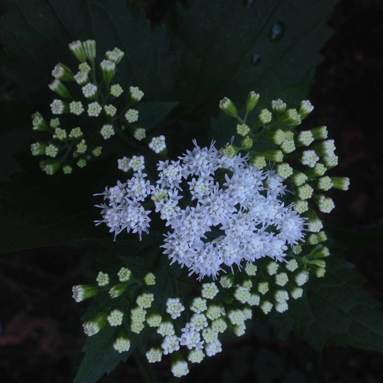 This picture turned out a little artier than I intended, but so be it. White snakeroot (Ageratina altissima) does like shade and flops around in the wind, two photo challenges.