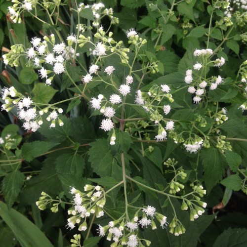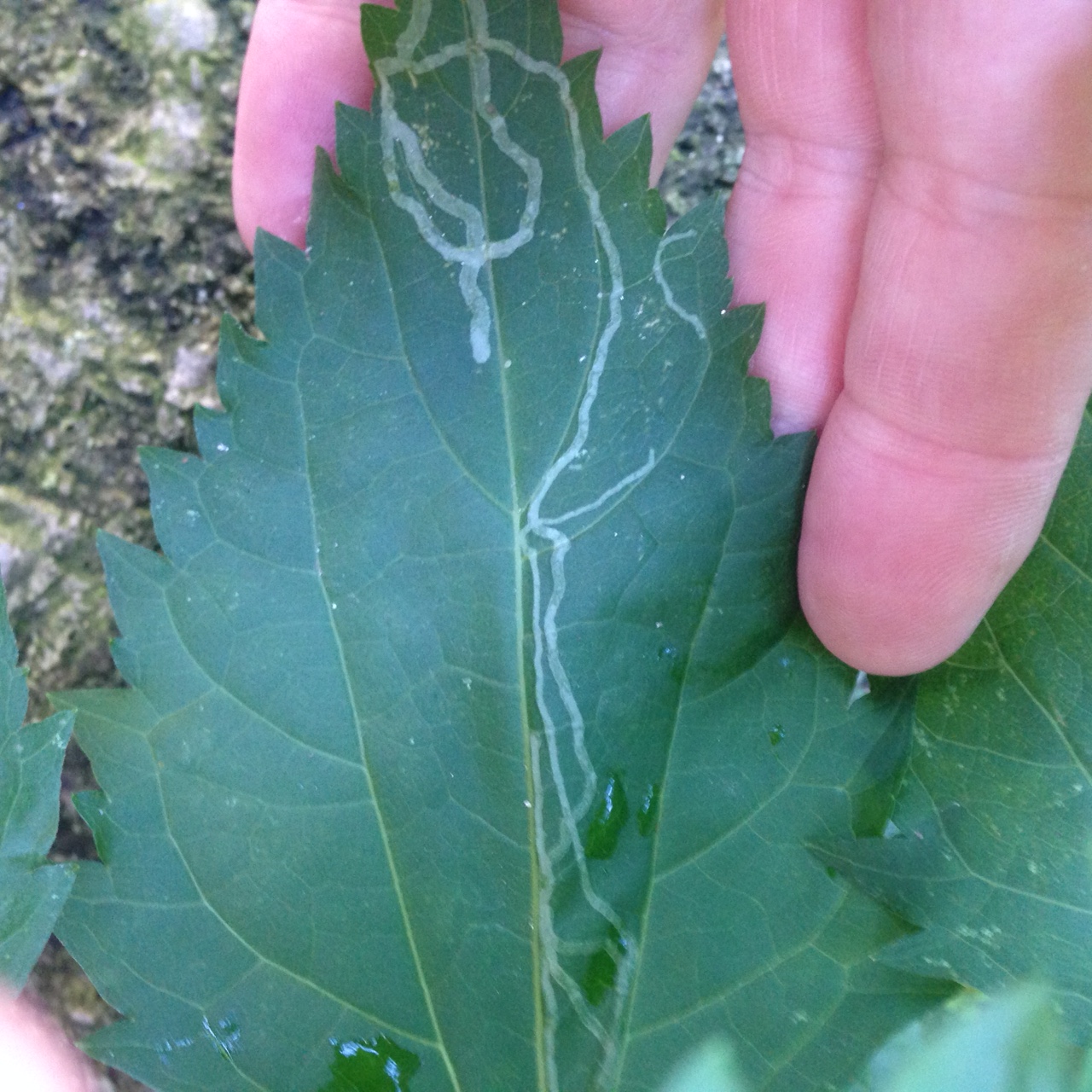 You’ll often see its leaves looking like this: these traces are the work of the larva of a fly, White Snakeroot Leafminer (Liriomyza eupatoriella). And as the EcoQuest Challenge page notes, that’s cool: this is an example of commensalism: the larvae benefit, the host isn’t harmed.