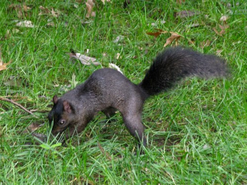 A melanistic variation on the ubiquitous Eastern Grey Squirrel, Sciurus carolinensis. These darker ones are said to tolerate colder weather better. Another notion has it that urban environments, with less predators, are also more likely to see greater numbers of both black and white variations of S. carolinensis.