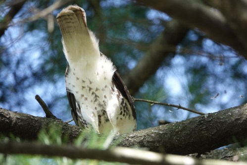 This Red-tailed Hawk in Green-Wood picked up a songbird and took into a pine to pluck. The prey was tiny, possibly a kinglet, hardly seemed worth the effort, and yet…