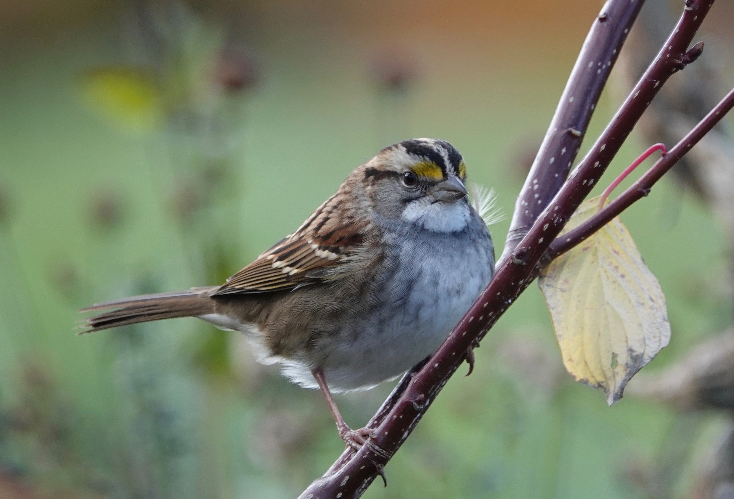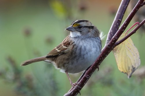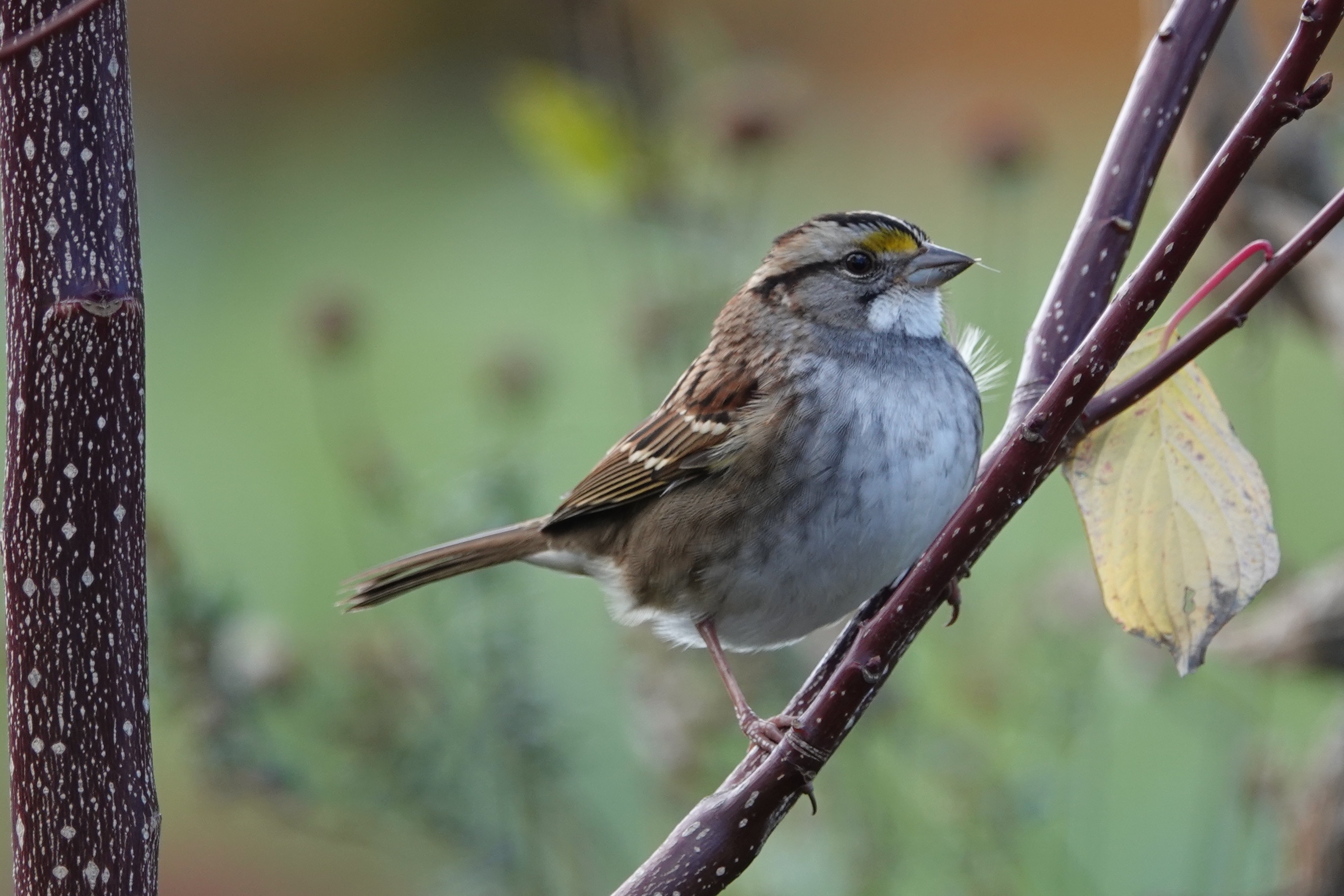 With some seeds still a-bill. These leaf-kicking sparrows should be around all winter, their “oh-sweet-canada” or, for patriots, “oh-sam-peabody” call echoing through the bare woods. This is one of the tan-striped forms. The white-striped forms have a bold white supercillium (eyebrow).