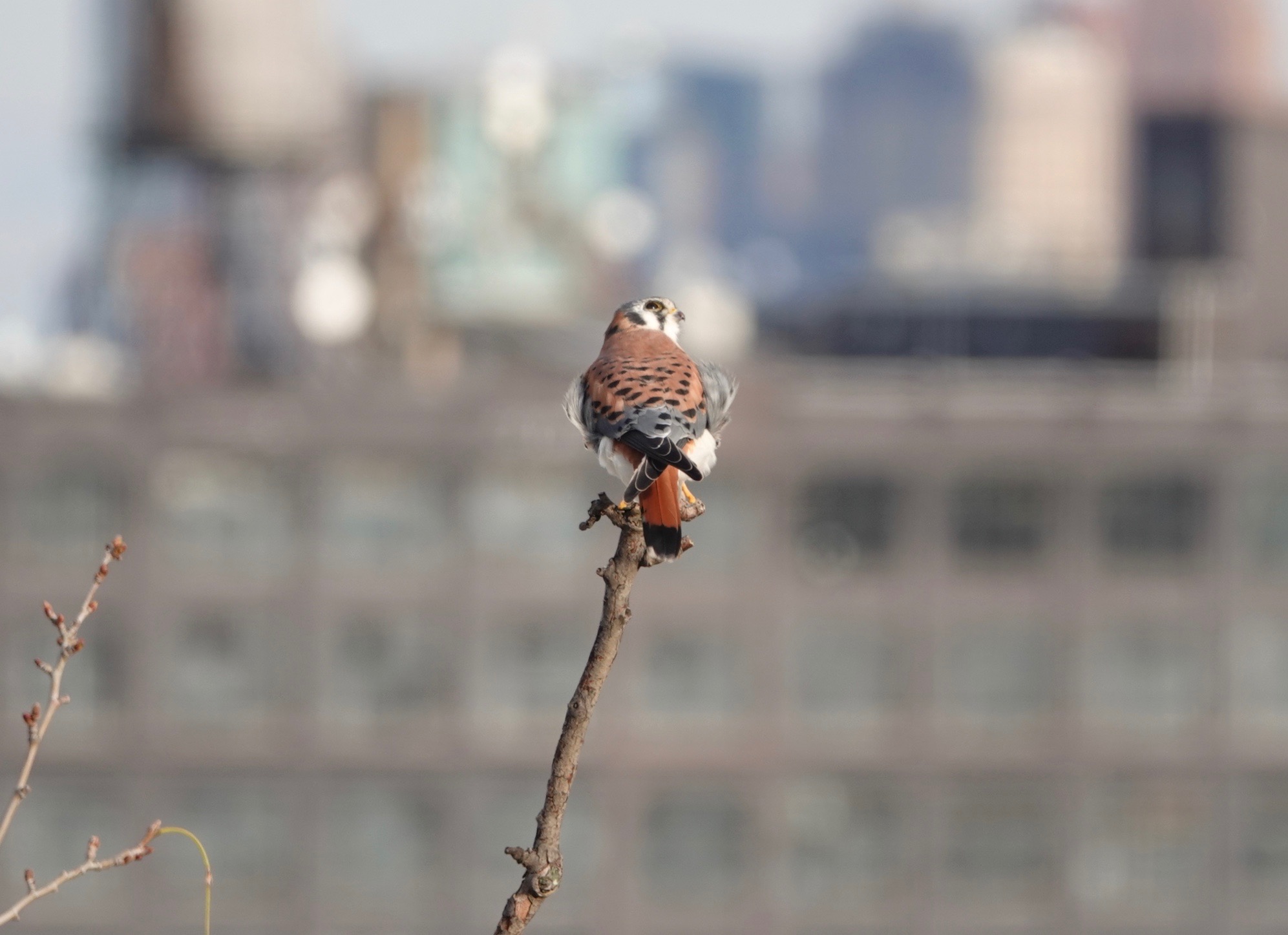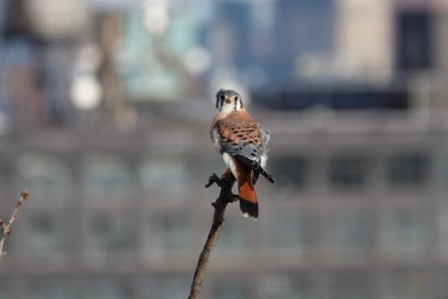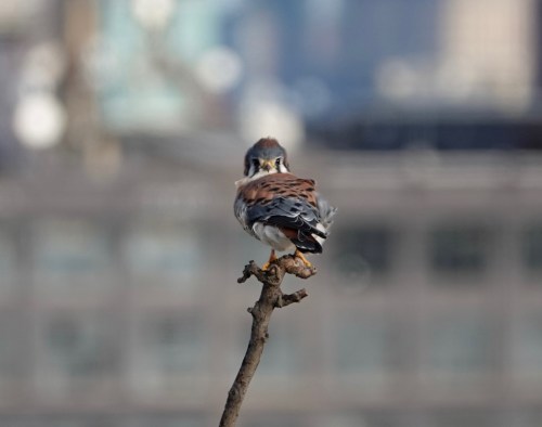 The pictures above are from Wednesday. The male American Kestrel was keeping an eye on the sky. If you’ve followed our #BrooklynKestrels adventures, you will recognize this knob of a perch. It’s an upright arm of a London Plane tree right across the street from the #ViewFromTheMoraine, a.k.a our apartment.