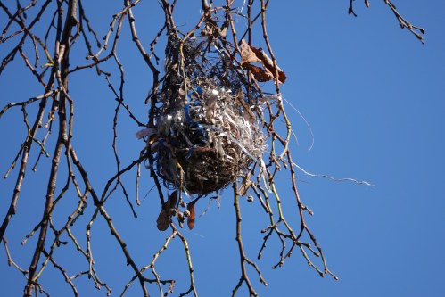 Woven from grasses and human garbage, suspended like a flapper’s purse. These things always surprise me because they seem so improbable as egg- and nestling-containers.