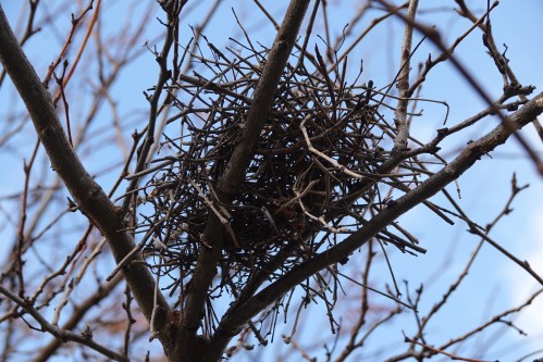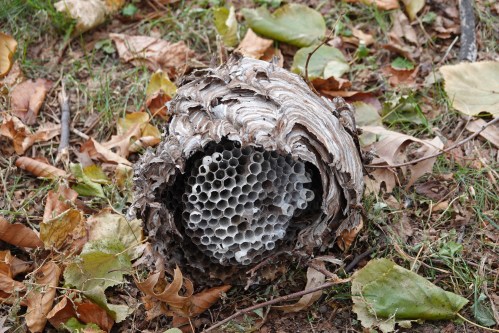 Paper wasp nest, from the same tree, if I’m not mistaken, as last year. The queen, the only member of the hive to overwinter, didn’t stray far.