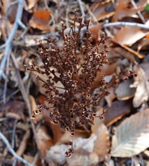Epifagus means “upon beech.” This is a winter view: these stalks will persist through the season. The small summer flowers are white and purple; they are evidently pollinated by ants. Although termed parasitic, the plants are not harmful to their beech tree hosts.