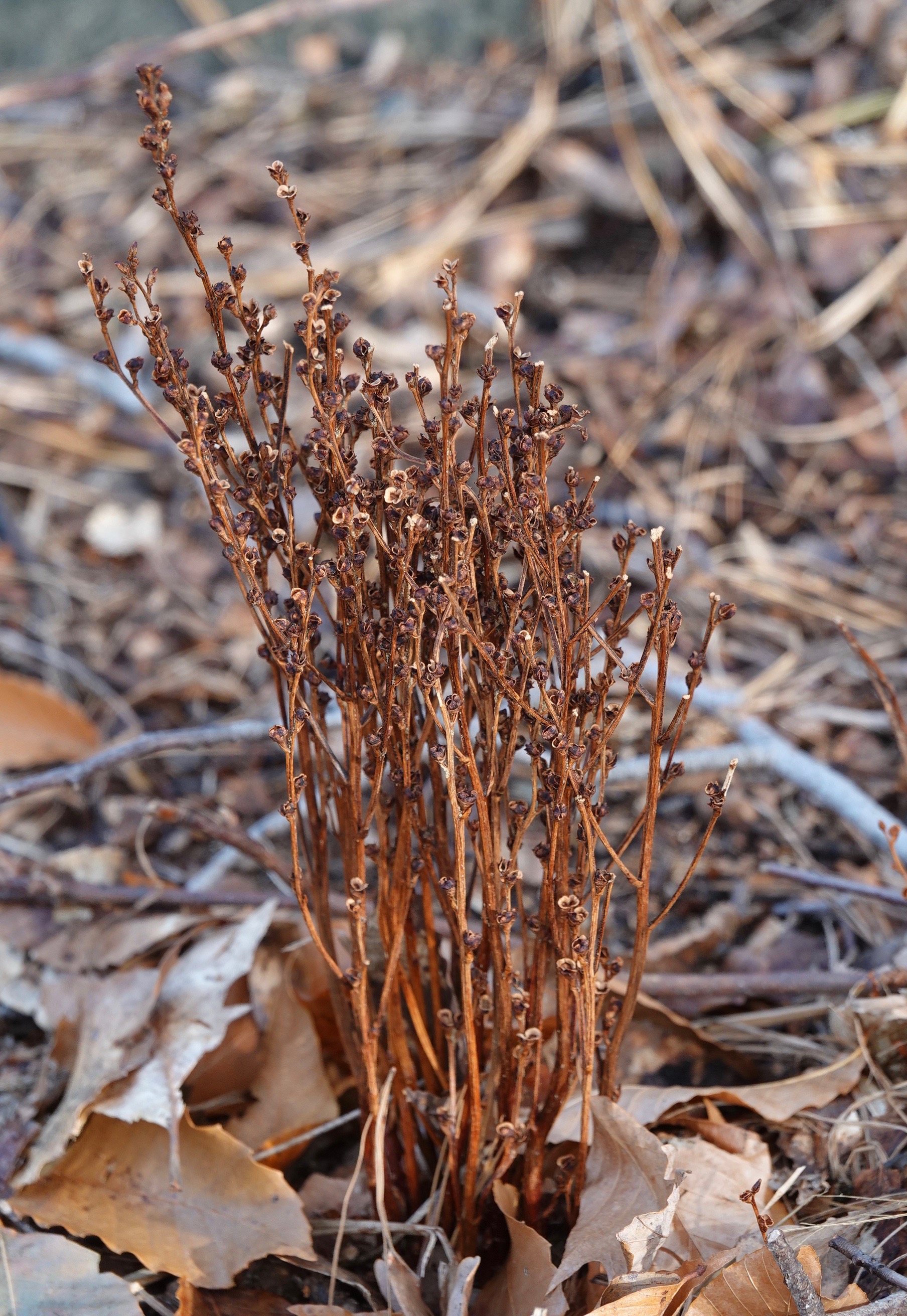 Beechdrops or Epifagus virginiana is a parasitic herbaceous plant. It doesn’t have chlorophyll. The plant taps into the roots of a beech to siphon off sustenance.