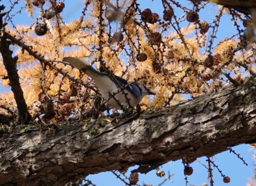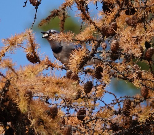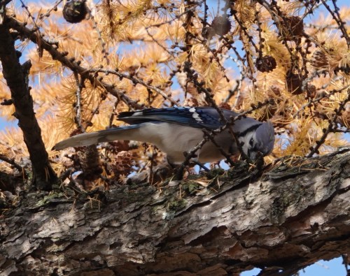 Blue Jay (Cyanocitta cristata) in a larch (Larix) scarfing up… something.