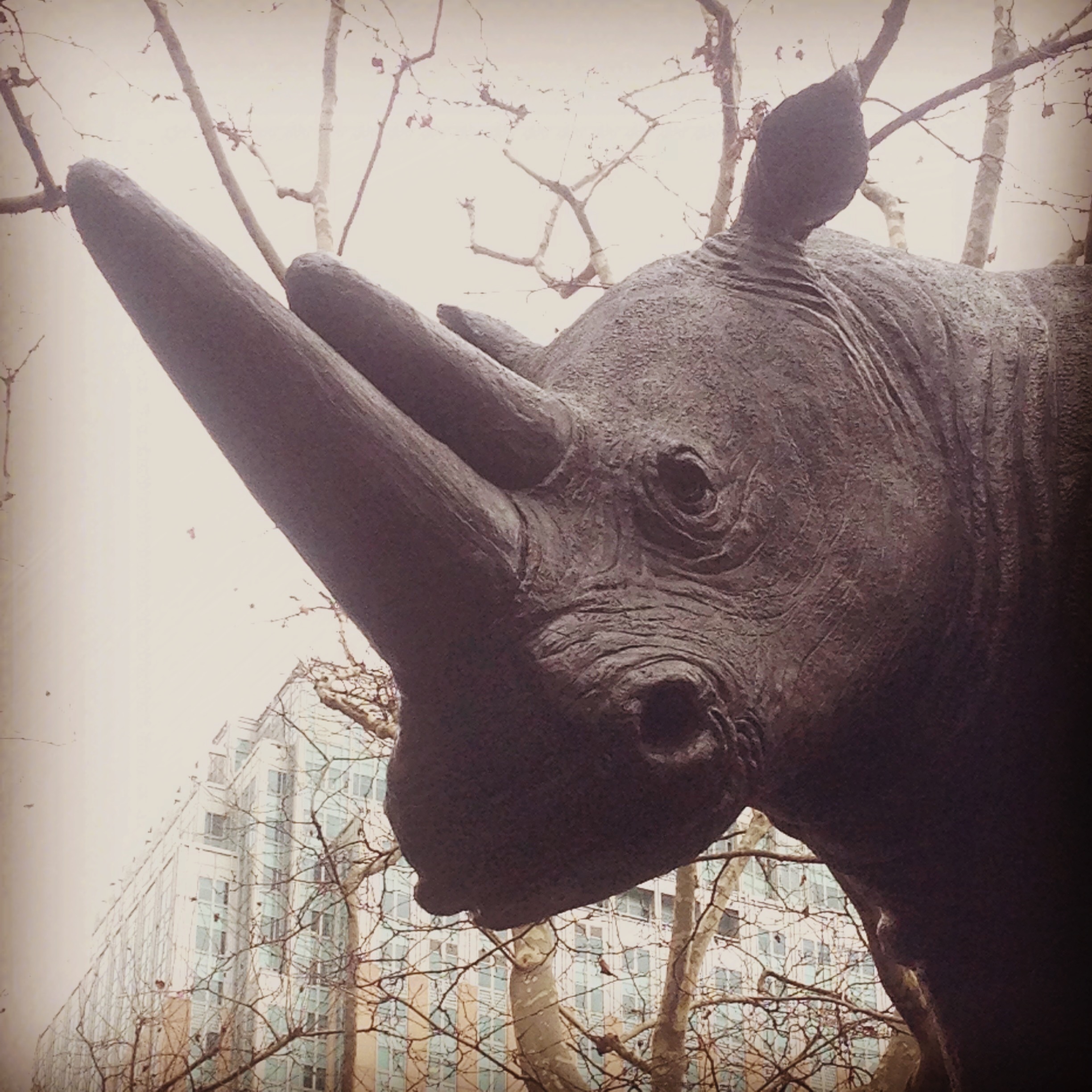 Dürer, Ionesco, Edinburgh’s Paperback Bookshop… now Brooklyn’s otherwise corporate MetroTech plaza has a rhino, too. A trio of them, to be exact, stacked. The sculpture, “The Last Three,” by Gillie & Marc, represent the last three — now there are two — white rhinos. This is a detail.