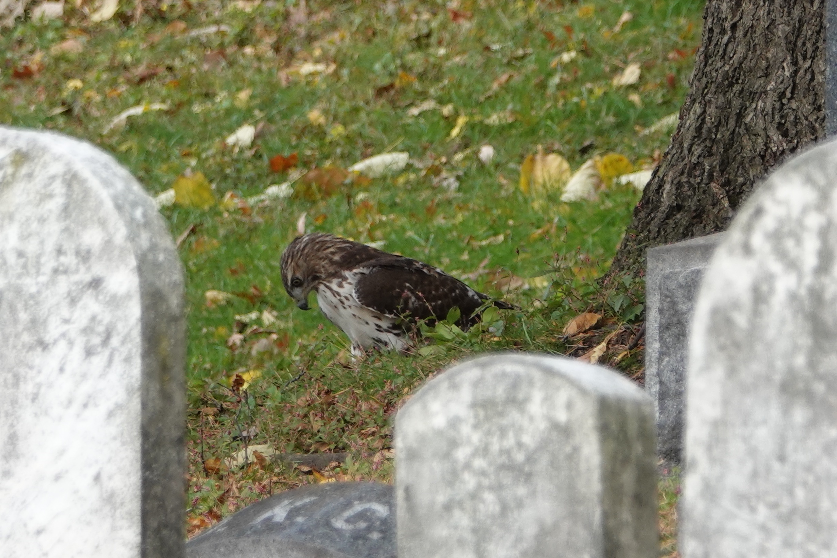 This Red-tailed Hawk sailed past me to land further up a slope in Green-Wood. Had it captured something?
